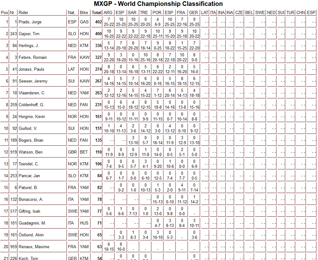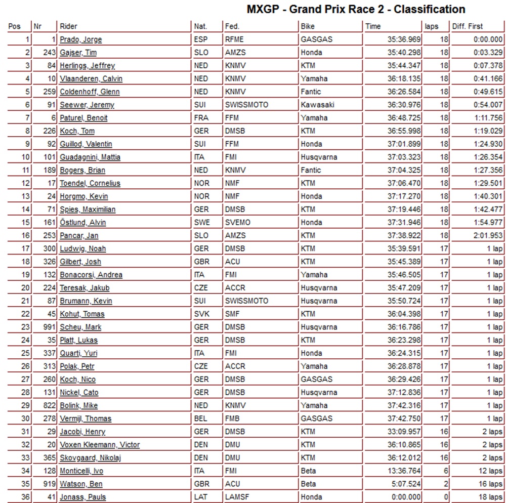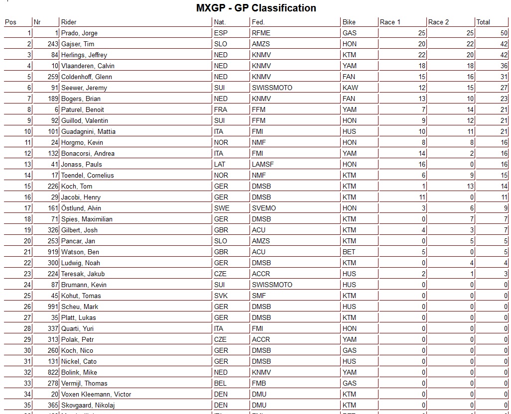 Dubbelslag voor Jorge Prado in Duitsland by motocrossplanet2 juni 2024 Jorge Prado heeft beide manches van de MXGP in Duitsland weten te winnen. Tim Gajser werd tweede 3-2 en Jeffrey Herlings derde 2-3. Bekijk hieronder de uitslagen: