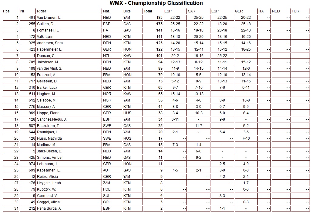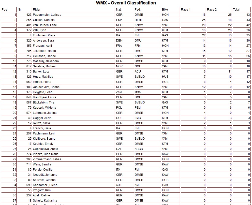 Lynn Valk heeft de tweede manche WMX in Duitsland weten te winnen. In de diepe modder nam Valk gelijk de leiding en controleerde vanaf dat moment de wedstrijd. Larissa Papenmeier werd tweede voor Lotte van Drunen, die na een slechte start toch nog goede zaken deed omdat Daniela Guillen vijfde werd. Danee Gelissen werkte opnieuw een sterke manche af en werd zesde!