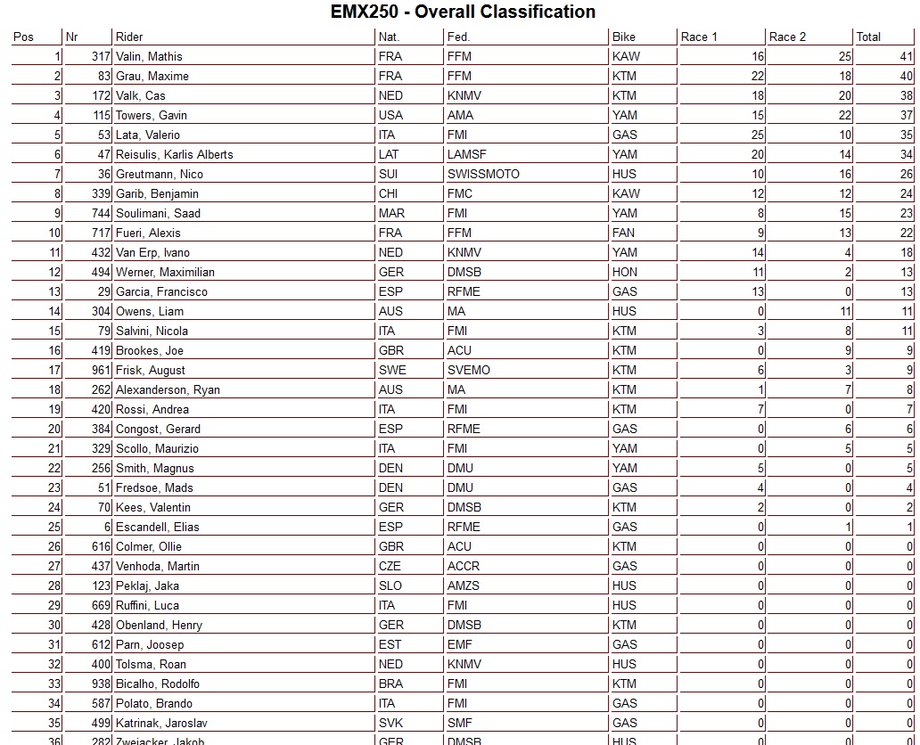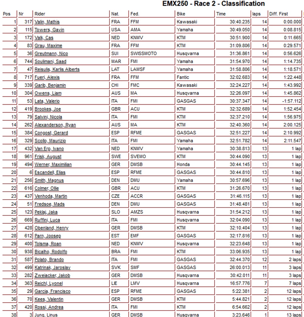 Mathis Valin heeft de tweede manche van het EMX250 Kampioenschap in Duitsland weten te winnen. Valin kwam als tweede over de finish maar door een penalty van Valerio Lata schoot hij een positie op en won de manche! Cas Valk kwam als derde over de finish en pakte hiermee ook de derde plaats in het dagklassement. Na een val in de beginfase werd Ivano van Erp zeventiende en Roan Tolsma sloot de manche af als 29ste.