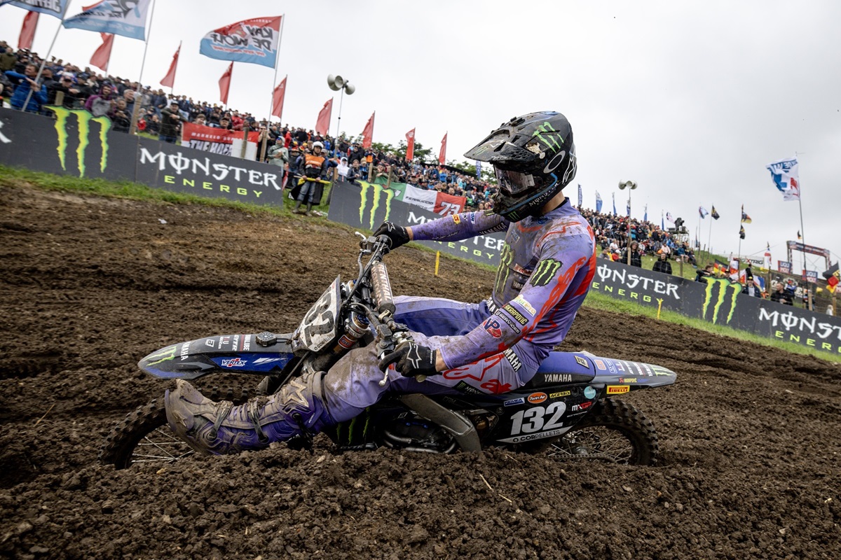 Race 1: “De start is de sleutel bij deze modderige omstandigheden,” zegt Vlaanderen vlak voor de start tijdens een flash-interview. Hij start ook goed ditmaal: zevende in de eerste bocht en al vierde na amper twee ronden. Calvin heeft de smaak nu te pakken: hij gaat mooi buitenom bij Coldenhoff en maakt dan jacht op vijfvoudig wereldkampioen Gajser. En ook die neemt hij – ditmaal binnendoor – te grazen. Calvin kan die tweede plek echter niet vasthouden. Hij gaat in de fout wanneer Herlings hem onder druk zet en valt terug naar de vierde plaats, waar hij nog even haasje-over speelt met Gajser.