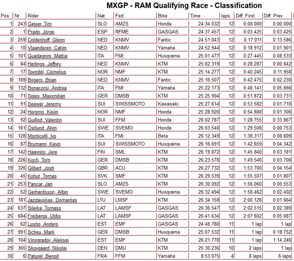 Gajser wint kwalificatieheat MXGP Letland by motocrossplanet8 juni 2024 Tim Gajser heeft de kwalificatieheat van de MXGP klasse in Letland weten te winnen voor Jorge Prado en Glenn Coldenhoff. Calvin Vlaanderen werd sterk vierde voor Mattia Guadagnini en Jeffrey Herlings.