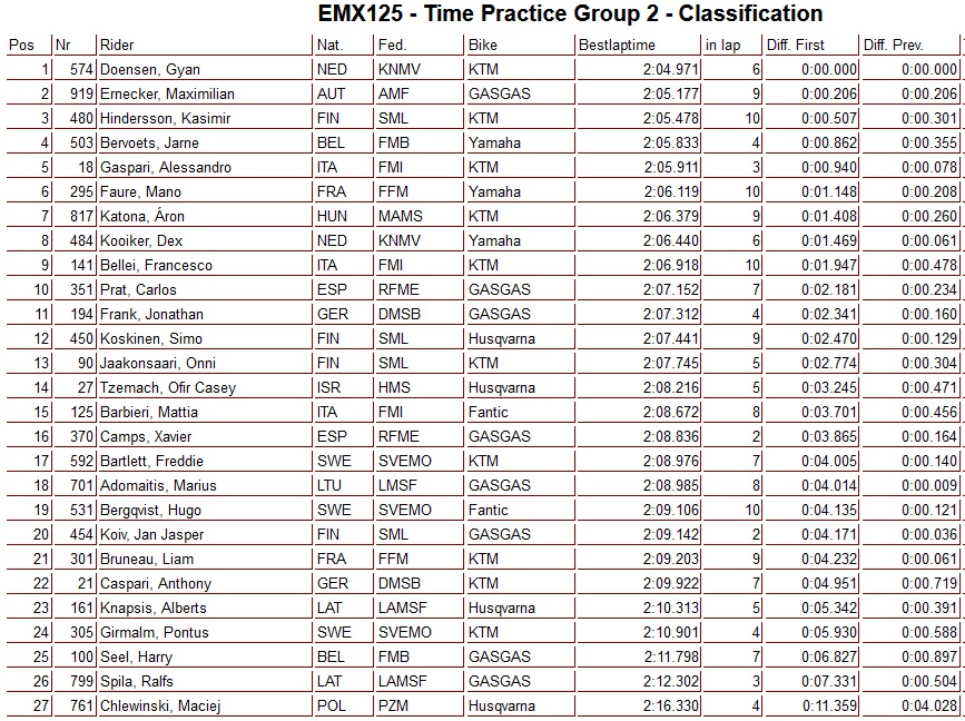 Gyan Doensen snelste in groep 2 EMX125 Letland by motocrossplanet8 juni 2024 Gyan Doensen heeft in de tweede groep van de EMX125 klasse in Letland de snelste tijd neer weten te zetten. Jarne Bervoets kwam uit op een vierde tijd en Dex Kooiker trainde als achtste!