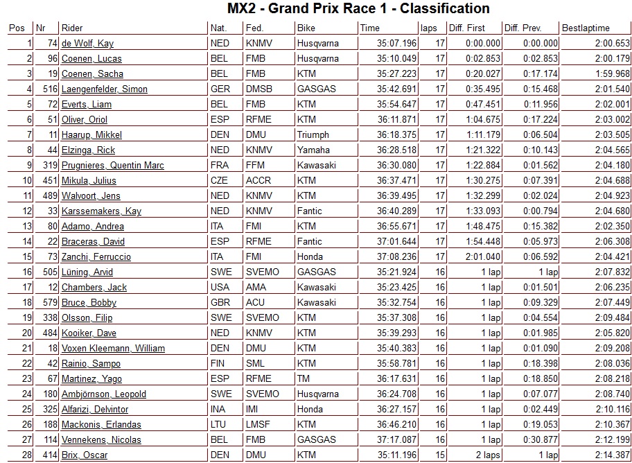 Kay de Wolf heeft de eerste manche van de Grand Prix in Letland weten te winnen voor Lucas Coenen en Sacha Coenen. Simon Laengenfelder en Liam Everts.