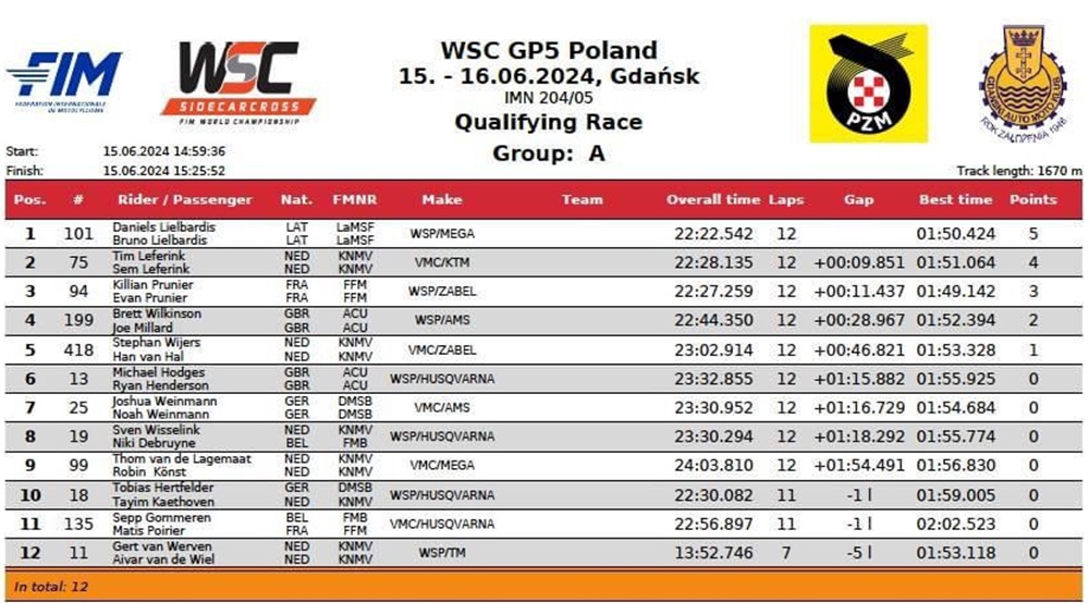 Lielbardis en Hermans winnen kwalificaties WK Zijspancross Polen by motocrossplanet15 juni 2024 Gebroeders Lielbardis en Hermans/van den Bogaart hebben de kwalificatieheats van de Grand Prix Zijspancross in Polen weten te winnen. Bekijk hieronder de uitslagen: