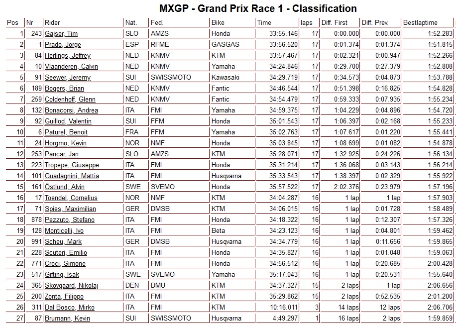 Tim Gajser heeft de eerste manche van de MXGP klasse in Maggiora weten te winnen. Gajser reed het grootste gedeelte van de wedstrijd aan de leiding maar had Jorge Prado en Jeffrey Herlings aan het achterwiel zitten. Alle drie de rijders gingen maximaal maar na een spannende manche was het Gajser die won voor Prado en Herlings.