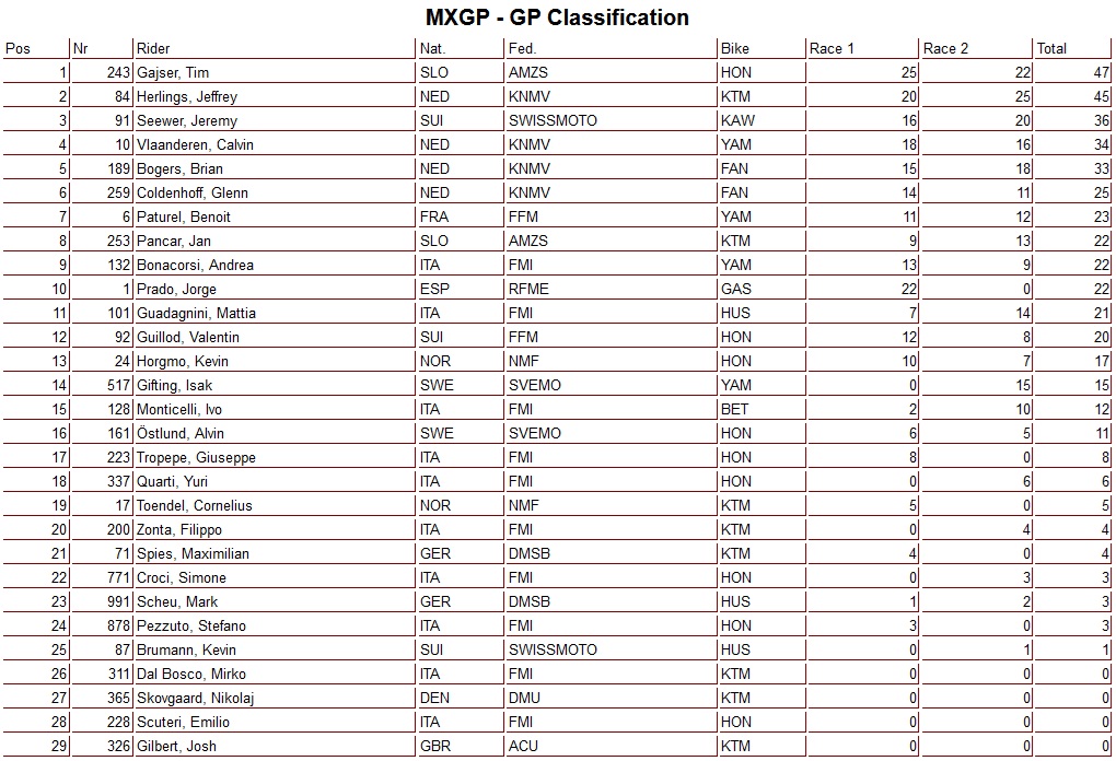 Jeffrey Herlings heeft de tweede manche van de MXGP in Maggiora gewonnen. Herlings zette Tim Gajser onder druk en toen deze in de fout ging, kon Herlings toeslaan en de manche winnen. Gajser werd tweede voor Jeremy Seewer. Jorge Prado kwam gelijk na de start ten val en verdween later uit de wedstrijd.