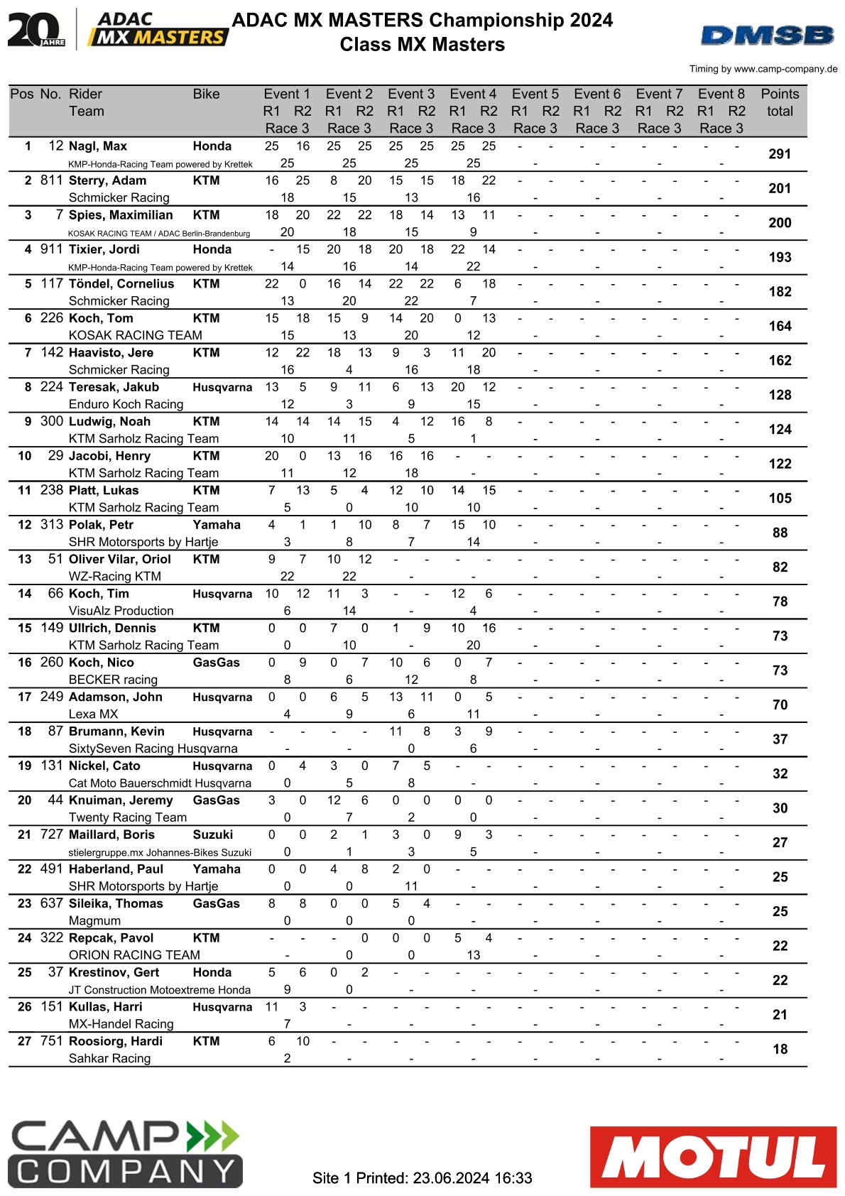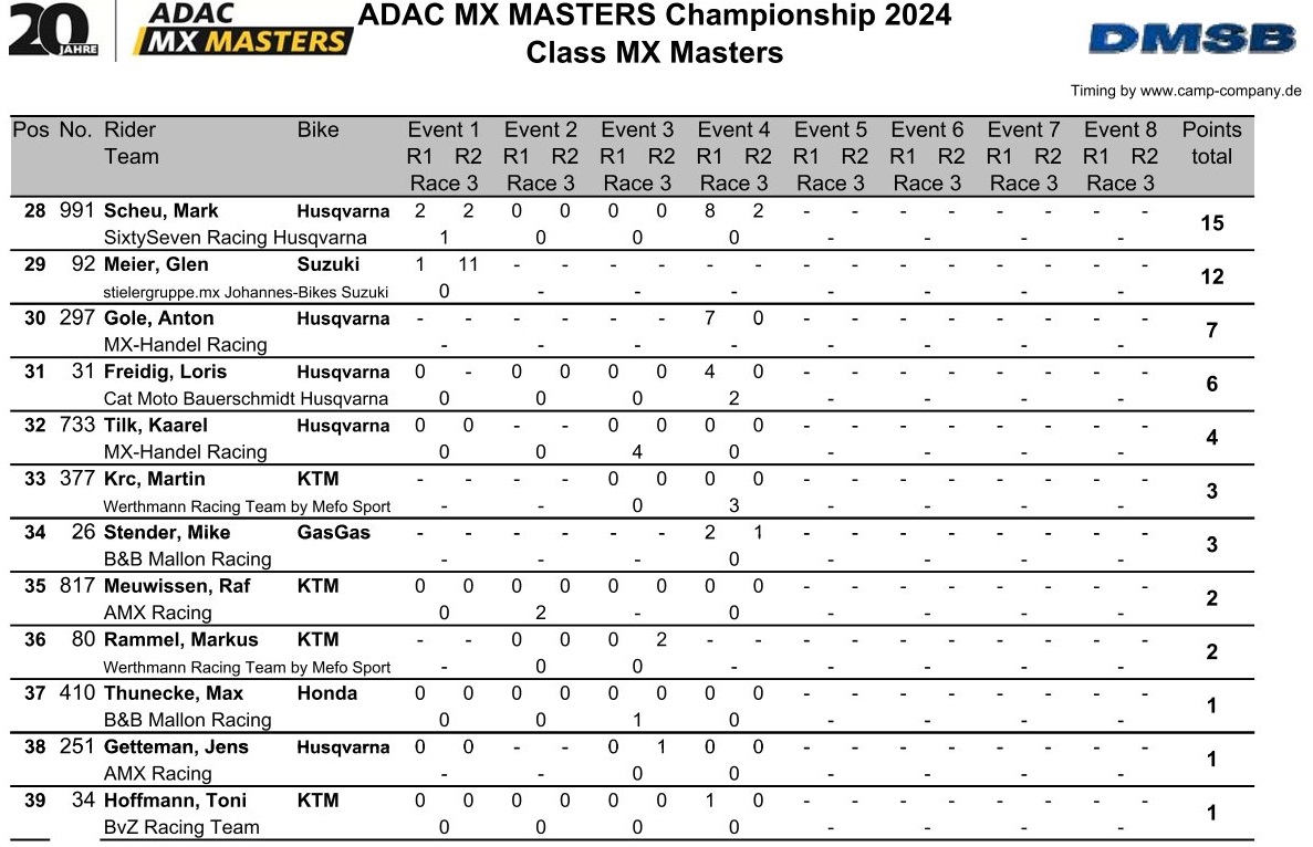 In de tussenstand van de ADAC Masters Series staat Nagl aan de leiding en heeft een voorsprong van 90 punten op Sterry en Spies bezet de derde plaats.