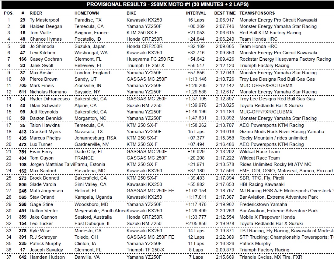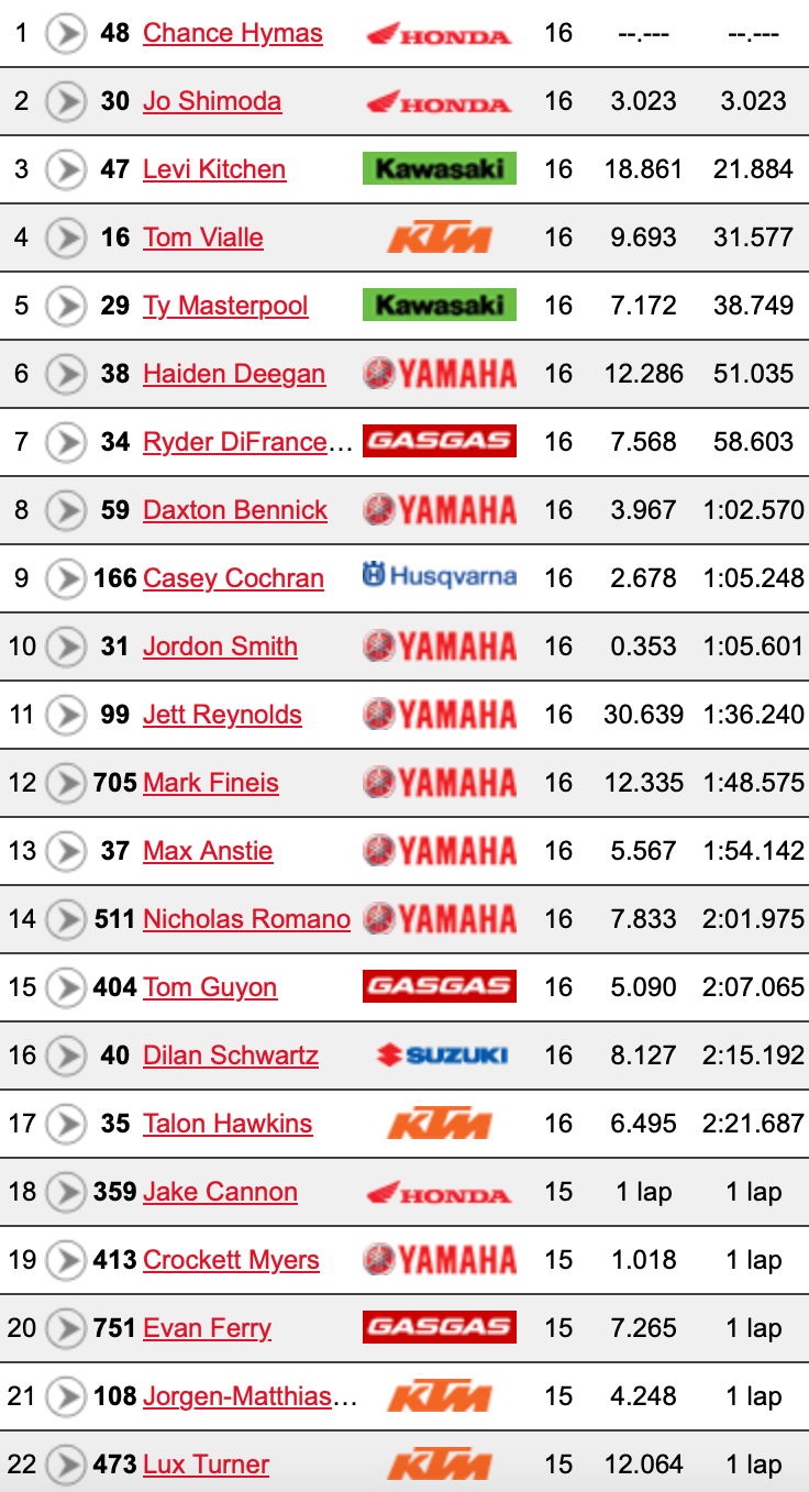 Chance Hymas heeft de vijfde wedstrijd van het AMA Pro Motocross Kampioenschap in Red Bud gewonnen. Hymas finishte als vierde in de eerste manche en won de tweede manche, wat voldoende was voor zijn allereerste eindzege uit zijn carriere.