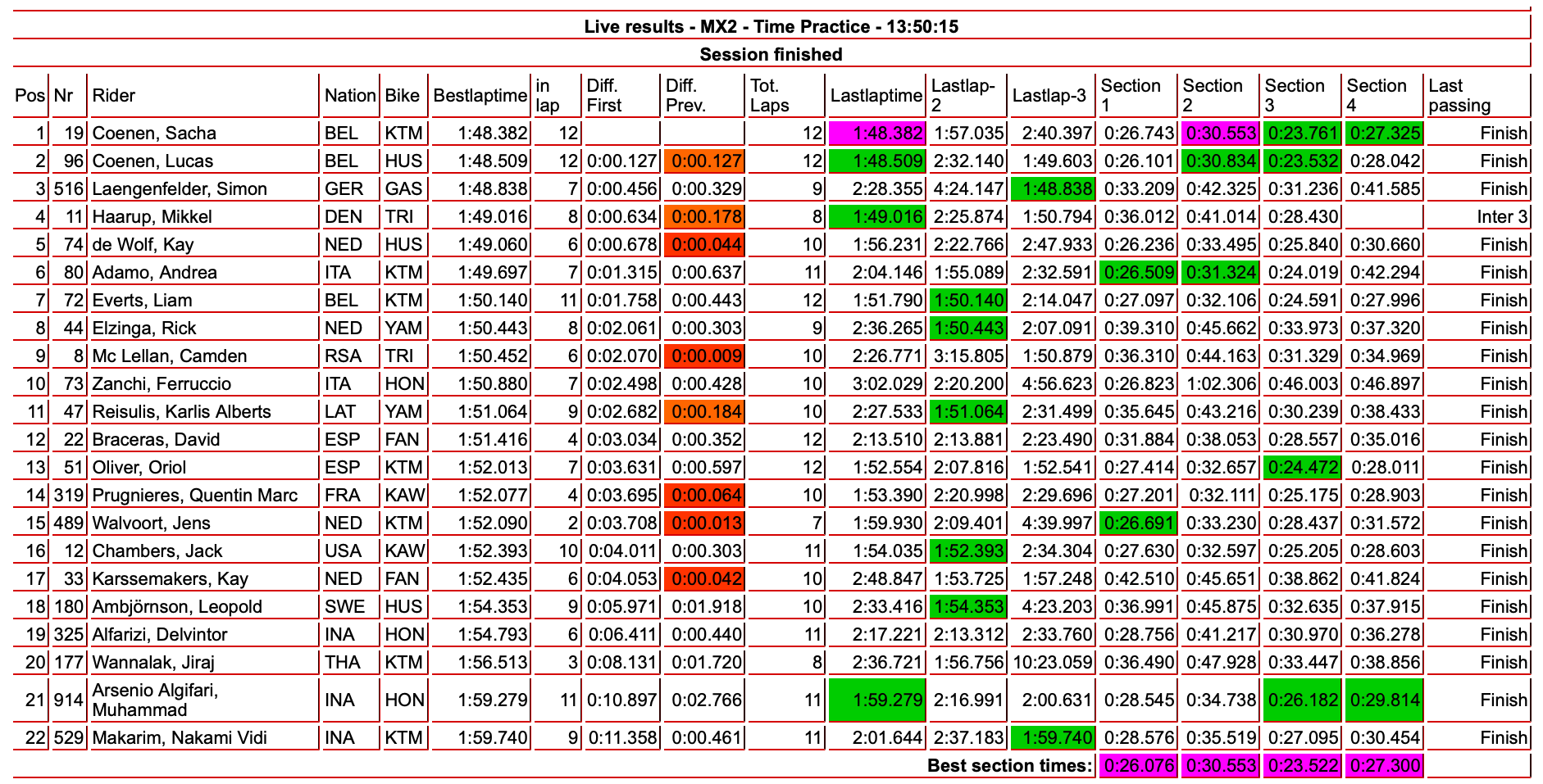 Sacha Coenen heeft in de tijdtraining van de MX2 klasse in Lombok de snelste tijd op de klok weten te zetten. Coenen was een fractie sneller dan zijn broer Lucas. Simon Laengenfelder sloot de sessie af als derde voor Mikkel Haarup en Kay de Wolf.