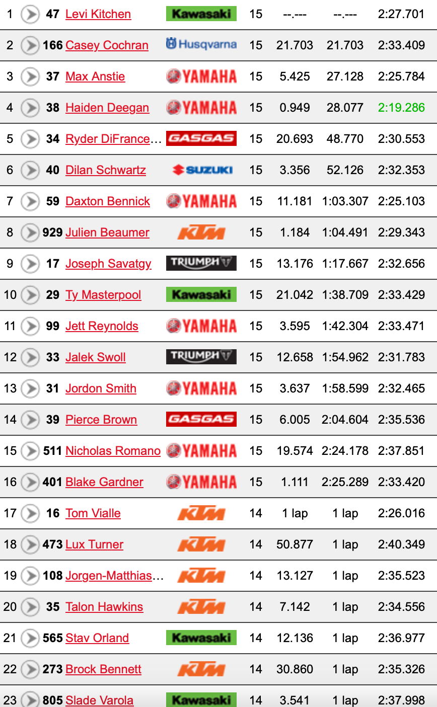 Casey Cochran werd in de tweede manche tweede voor Max Anstie. Haiden Deegan kwam bij de start ten val met o.a. Ty Masterpool en Jo Shimoda. Deegan vocht zich terug naar een vierde plaats en wist hiermee tweede te worden in het dagklassement voor Cochran!