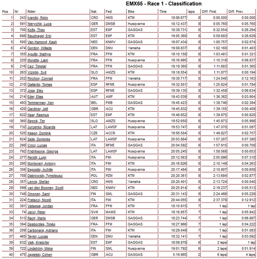 Kash van Hamond is in de eerste manche van de EMX65 finale in Loket vijfde geworden. Van Hamond moest bij de start een valpartij ontwijken en moest van ver terug komen. Van Hamond wist nog vijfde te worden en houdt hiermee zijn kansen op het podium open.