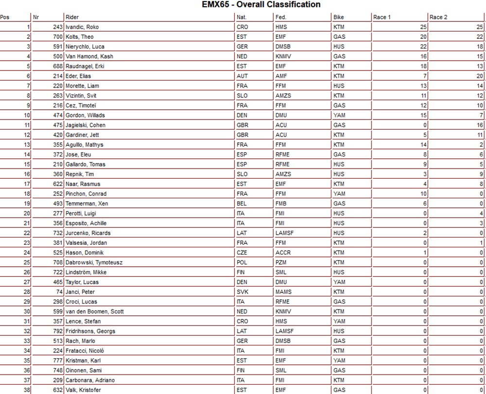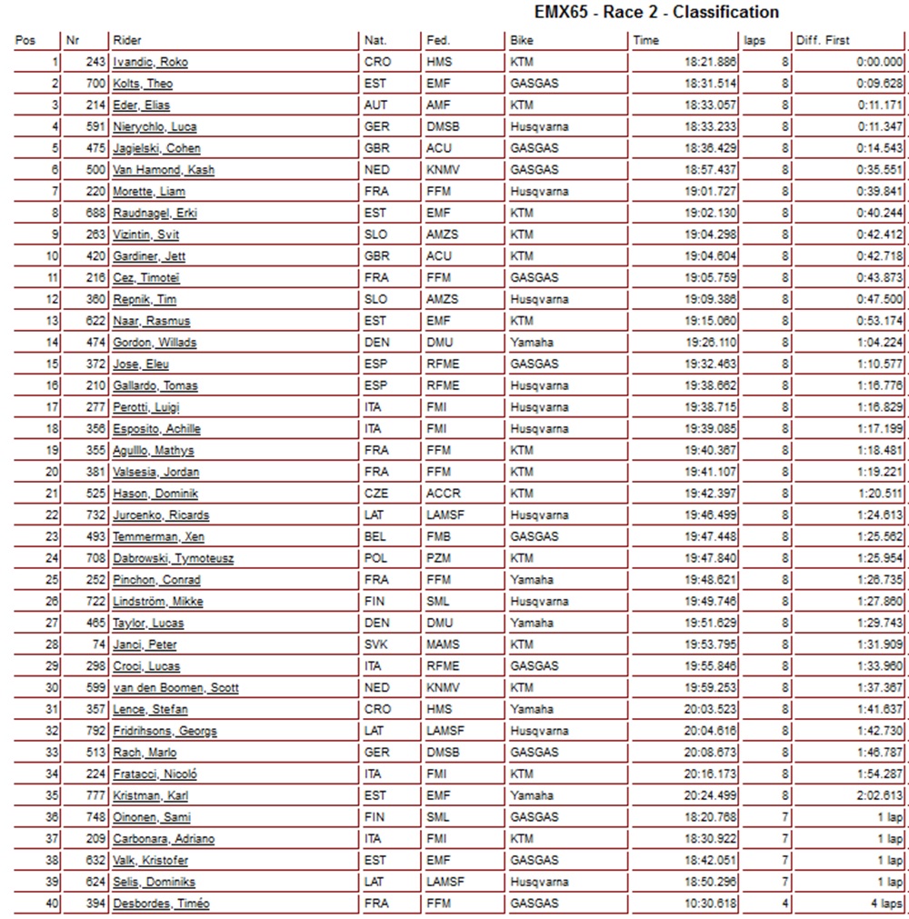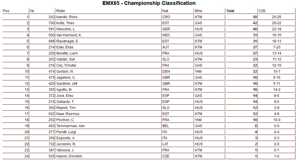 De Europese titel in de 65cc klasse ging naar Roko Ivandic 1-1 voor Theo Kolts 3-2 en Luca Nierychlo 2-4.