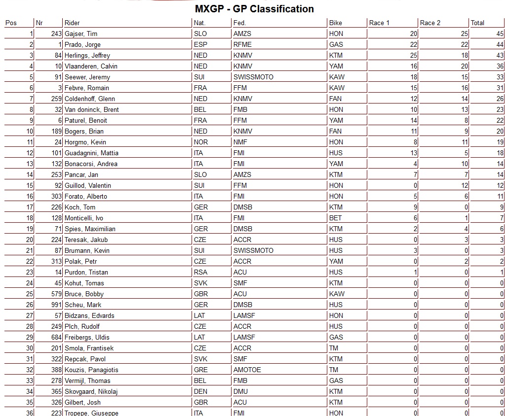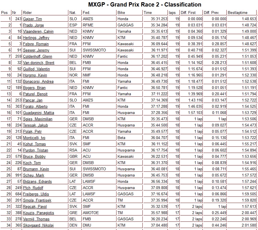 Tim Gajser heeft de tweede manche in de MXGP-klasse op zijn naam geschreven. De Sloveen begon de wedstrijd als tweede maar wist na een aantal ronden de leiding over te nemen van Jorge prado. Achter de twee koplopers werd Calvin Vlaanderen Sterk derde. Jeffrey Herlings kende, na de zege in de eerste manche, een dramatisch begin van de tweede manche. Na twee val partijen in de eerste paar bochten moest hij vanuit de achterhoede aan zijn wedstrijd beginnen. Na een sterke wedstrijd waarin hij veel plaats wist goed te maken moest hij uiteindelijk genoegen nemen met de vierde plaats. Glenn Coldenhoff werd zevende en zijn teamgenoot Brian Bogers werd negende. De Grand Prix werd gewonnen door Tim Gajser voor Jorge Prado en Jeffrey Herlings.