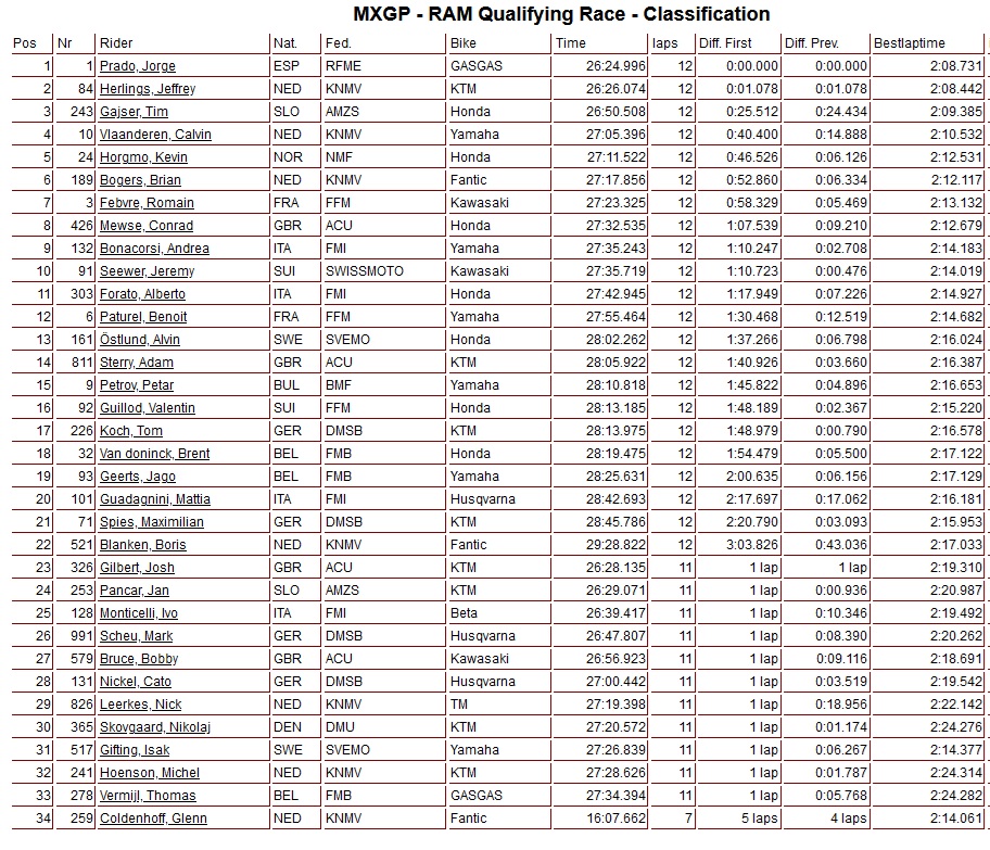 Jorge Prado heeft de kwalificatieheat van de MXGP-klasse in Lommel gewonnen. Jeffrey Herlings zette hem onder druk tot aan de finishvlag en eindigde als tweede, voor Tim Gajser.