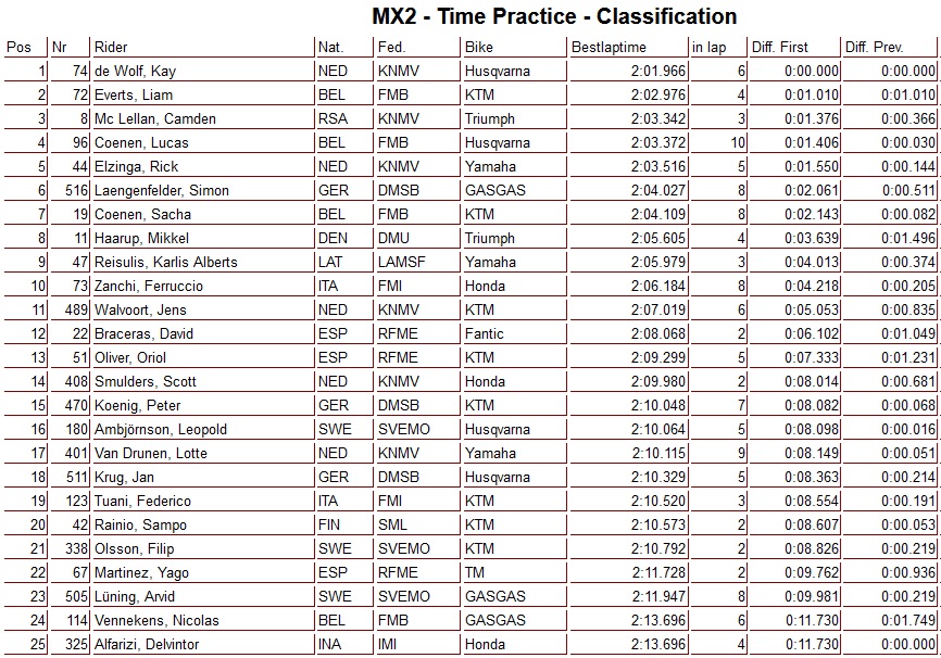 Kay de Wolf snelste in tijdtraining MX2 Lommel by motocrossplanet27 juli 2024 Kay de Wolf heeft in de tijdtraining van de MX2 klasse in Lommel de snelste tijd neer weten te zetten. Bekijk de volledige uitslag hieronder: