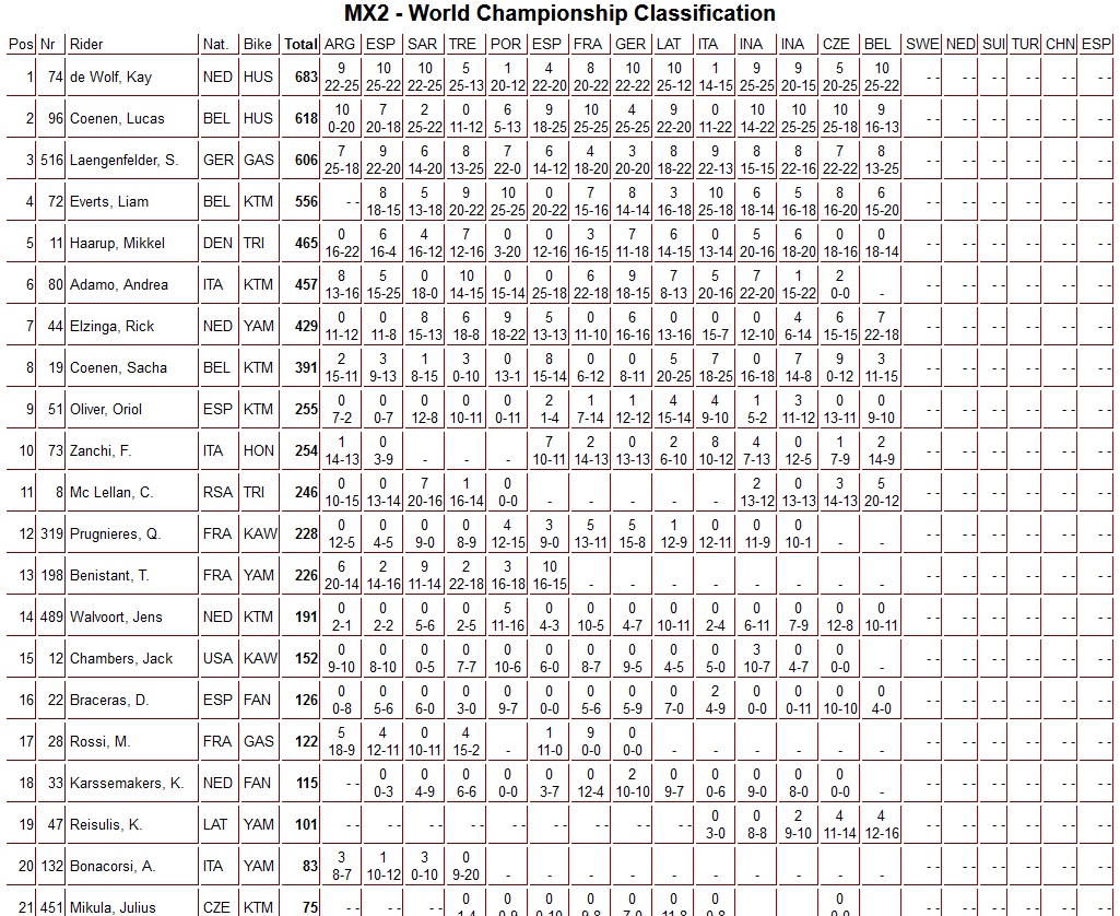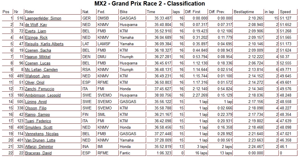 De holeshot in de tweede manche was opnieuw voor Sacha Coenen gevolgd door Rick Elzinga, Karlis Reisulis, Kay de Wolf en Simon Laengenfelder. Nummer twee in de tussenstand van het FIM Wereldkampioenschap MX2 Lucas Coenen kwam in de eerste ronde ten val en moest genoegen nemen met een achtste plaats.