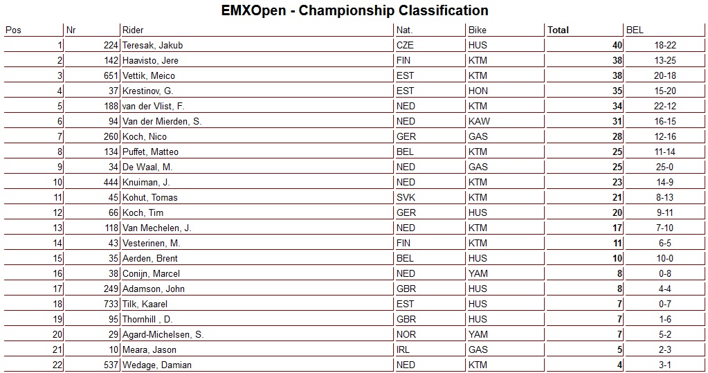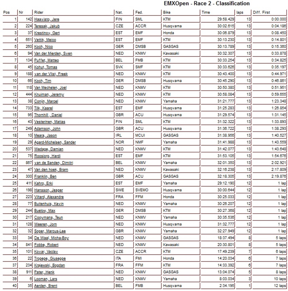 Jere Haavisto heeft de tweede manche van EMXOpen gewonnen, Jakub Teresak werd tweede voor Gert Krerstinov. De tweede plaats van Jakub Teresak was voor hem genoeg om de EMXOpen klasse te winnen voor Jerre Haavisto en Meico Vettik. Micha-Boy de Waal die gisteren de eerste manche wist te winnen was bezig aan een sterke opmars tot hij kreeg af te rekenen met mechanische problemen.