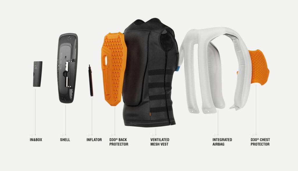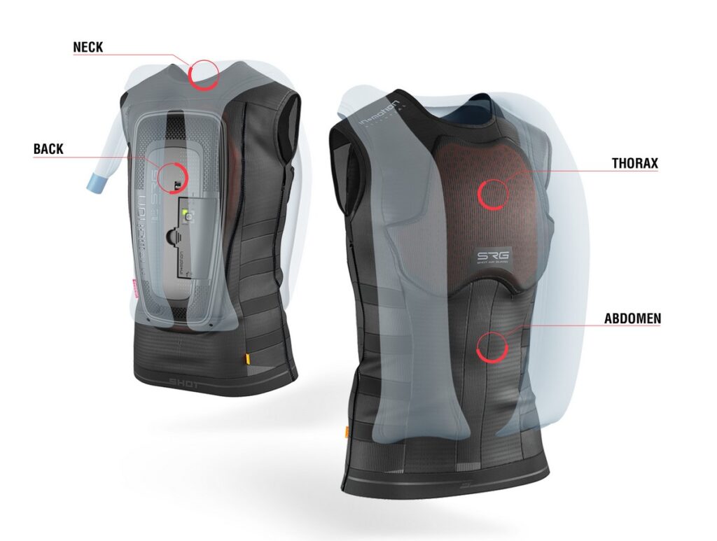 Naast de geïntegreerde airbagzak bevat de SRG een D3O protector vooraan en een D3O protector achteraan. Deze passieve protectoren, respectievelijk niveau 2 gecertificeerd voor de rug en niveau 1 gecertificeerd voor de borst (borst niveau 2 is ook beschikbaar), staan garant voor de beste bescherming die momenteel beschikbaar is. Dankzij de CE-gecertificeerde airbag bereikt SRG een ongeëvenaard niveau van bescherming voor vitale delen van het bovenlichaam, waaronder de rug, nek, buik en borstkas.