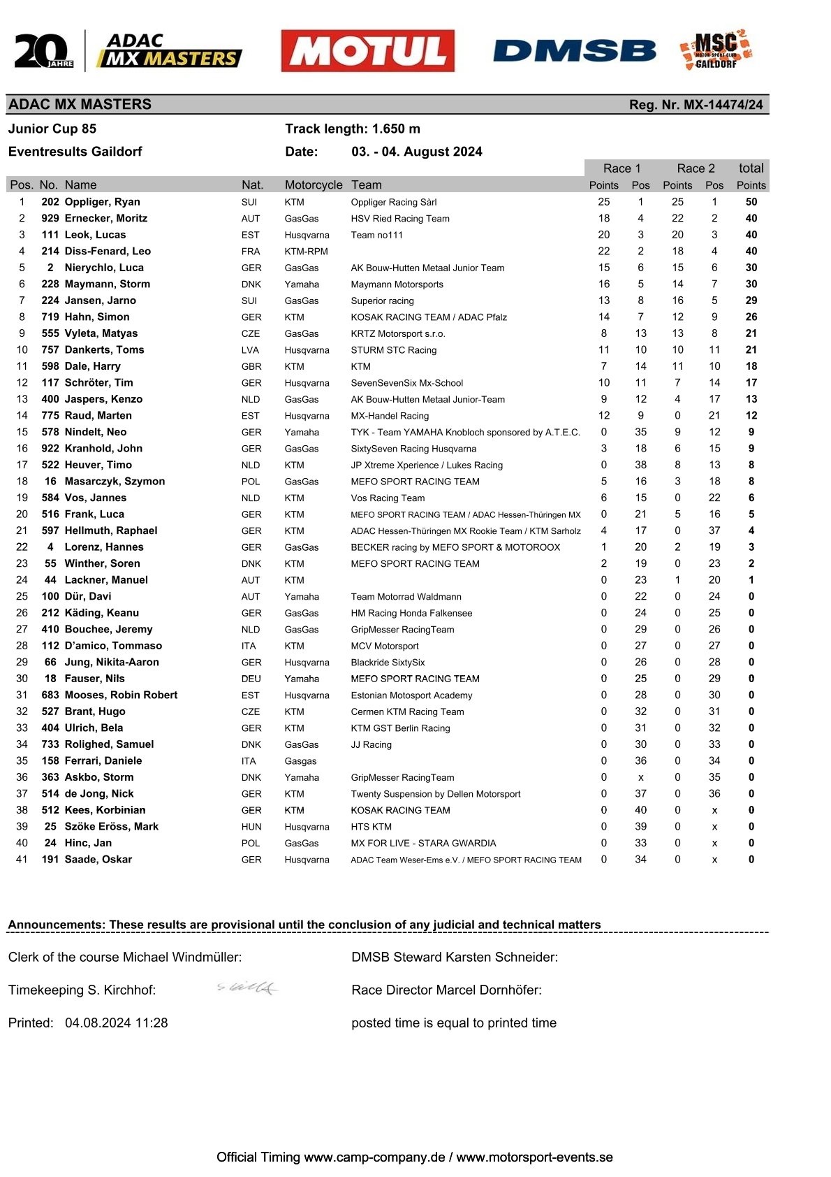 Harry Dale werd elfde (14-10), Kenzo Jaspers dertiende (12-17), Timo Heuver zeventiende (38-13) en Jannes Vos negentiende (15-22). Jeremy Bouchee legde beslag op een 29ste en een 26ste plaats.