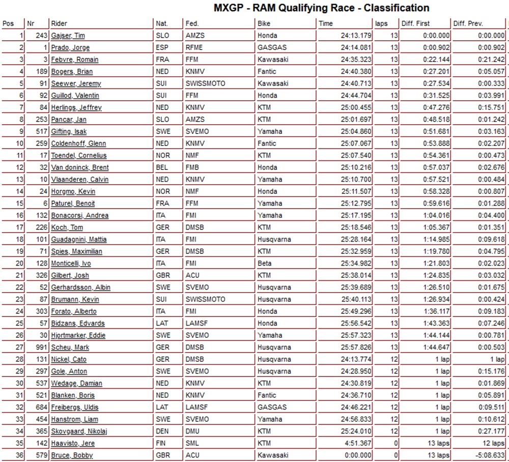Tim Gajser heeft de kwalificatieheat van de MXGP klasse weten te winnen in Zweden voor Jorge Prado en Romain Febvre. Brian Bogers reed de eerste tien minuten aan de leiding en werd sterk vierde. Calvin Vlaanderen kwam in de eerste bocht ten val en nam Jeffrey Herlings met zich mee. Herlings kwam nog terug naar een zevende plaats terwijl Vlaanderen dertiende werd. Glenn Coldenhoff kwam als tiende binnen! Damian Wedage en Boris Blanken werden dertigste en eenendertigste.