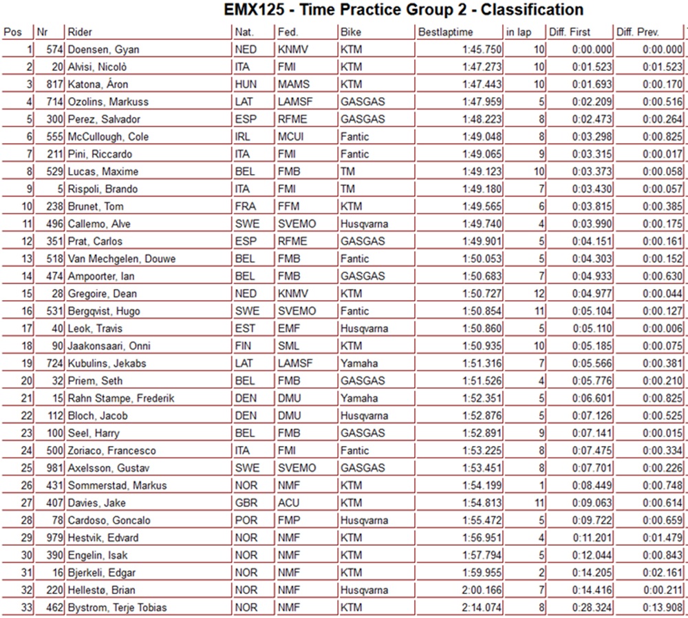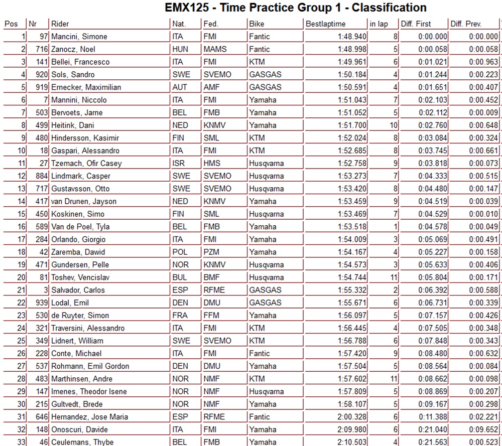 Mancini en Doensen snelste in tijdtraining 125 in Zweden by motocrossplanet10 augustus 202410 augustus 2024 Simone Mancini en Gyan Doensen hebben in de tijdtraining van de 125 klasse in Zweden de snelste tijden op de klok weten te zetten. Bekijk hieronder de volledige uitslagen:
