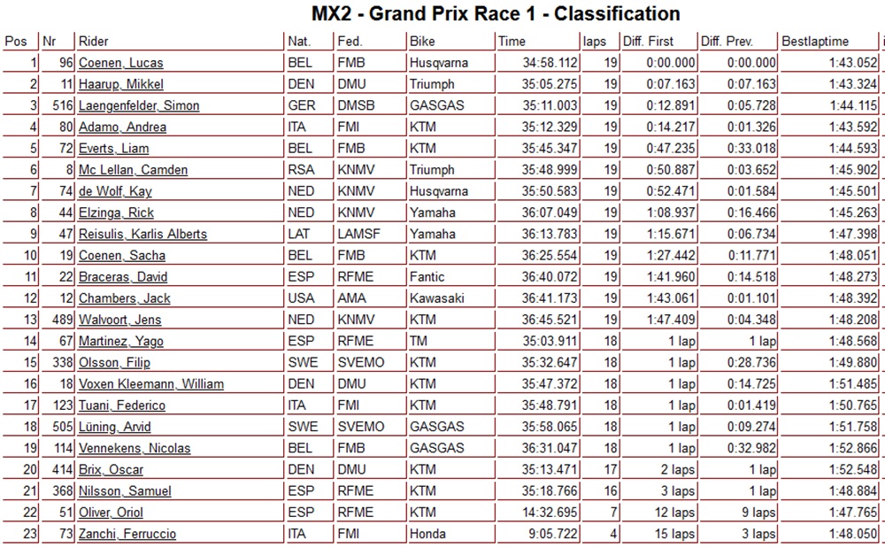 Lucas Coenen heeft de eerste manche van de MX2 klasse in Zweden gedomineerd. Coenen won de manche voor Mikkel Haarup en Simon Laengenfelder. Liam Everts werd vijfde en Kay de Wolf kwam na twee valpartijen in de beginfase terug naar een zevende plaats.