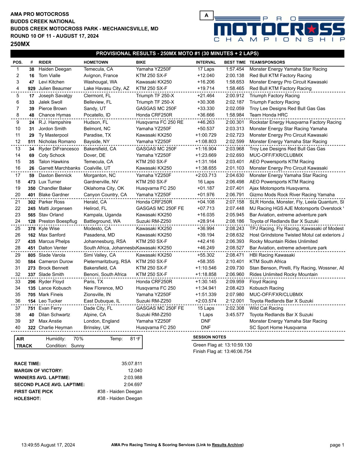 Met een overwinning in de eerste manche van de AMA Pro Motocross in Budds Creek is Haiden Deegan kampioen geworden in de 250 klasse. Deegan won de manche voor Tom Vialle en Levi Kitchen.