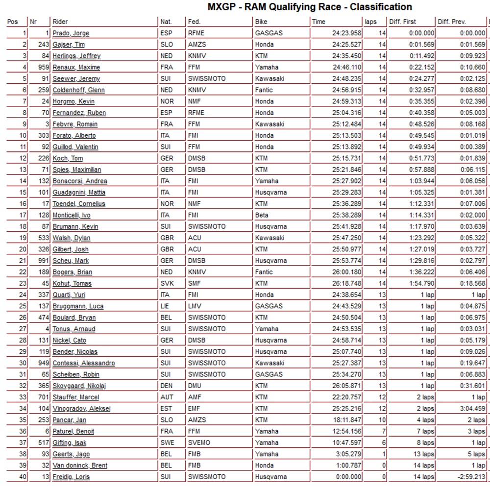 Jorge Prado heeft de kwalificatieheat van de MXGP klasse in Zwitserland gewonnen voor Tim Gajser en Jeffrey Herlings. Glenn Coldenhoff finishte op een nette zesde plaats. Brian Bogers kwam na een val als tweeëntwintigste binnen.