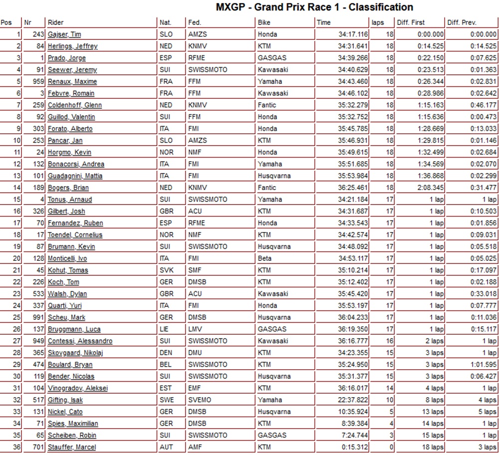 Gajser wint eerste manche in Zwitserland voor Herlings by motocrossplanet25 augustus 202425 augustus 2024 Tim Gajser heeft de eerste manche van de MXGP in Zwitserland weten te winnen voor Jeffrey Herlings en Jorge Prado. Glenn Coldenhoff werd na een constante wedstrijd zevende en Brian Bogers kwam als veertiende binnen. @shotbybavo