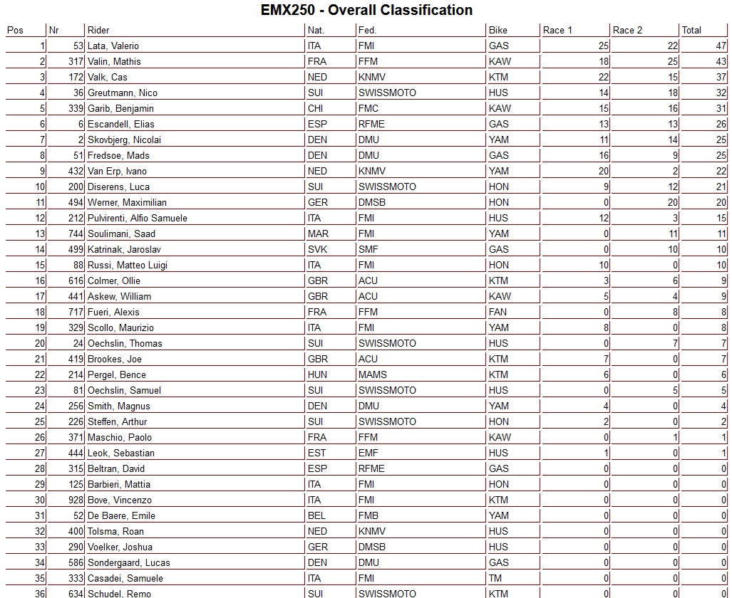 Met een 2-6 in de manches is Cas Valk derde geworden in de EMX250 wedstrijd in Zwitserland. De overwinning in de tweede manche ging naar Mathis Valin voor Valerio Lata.