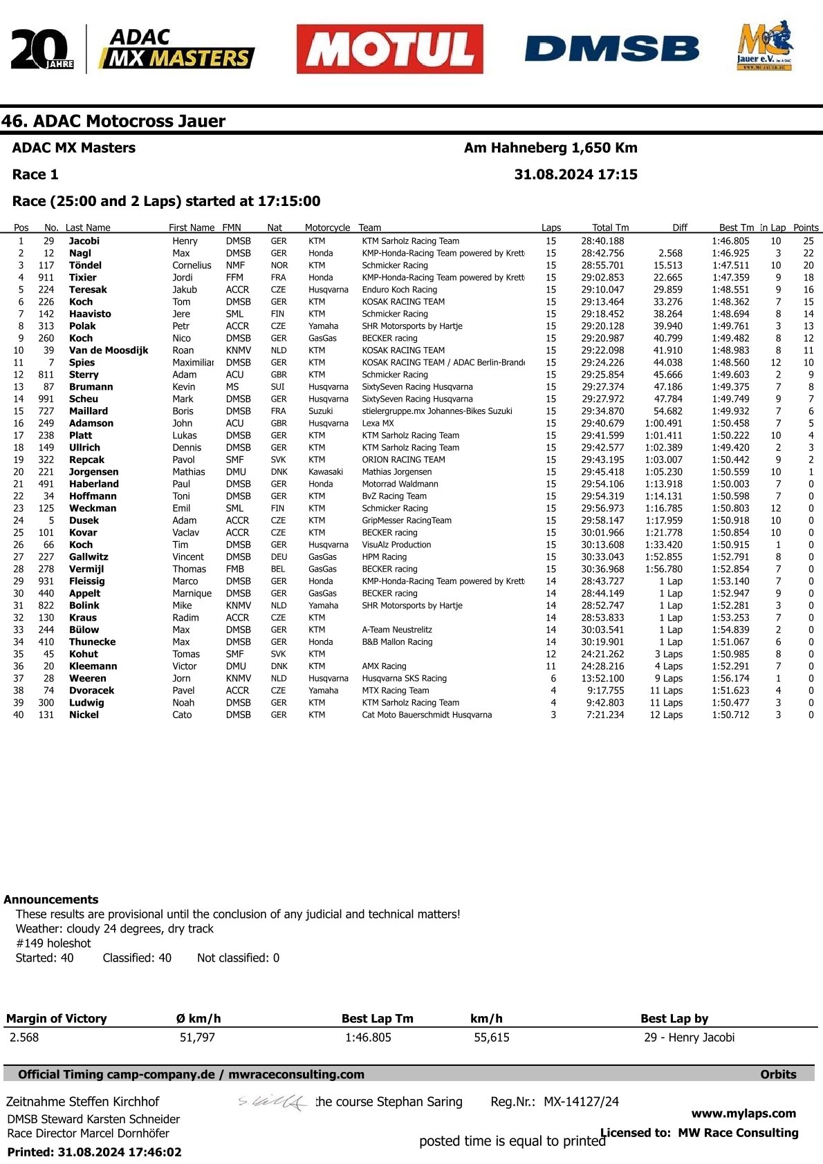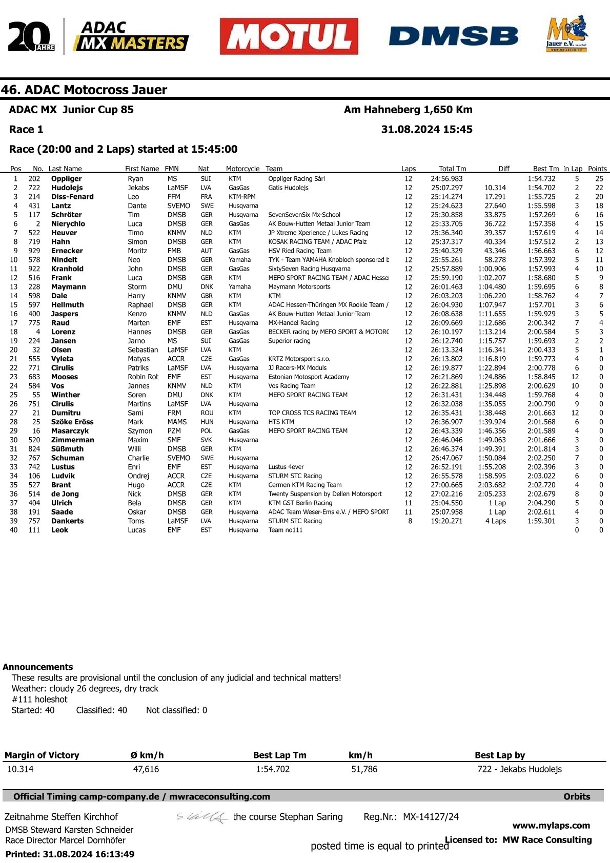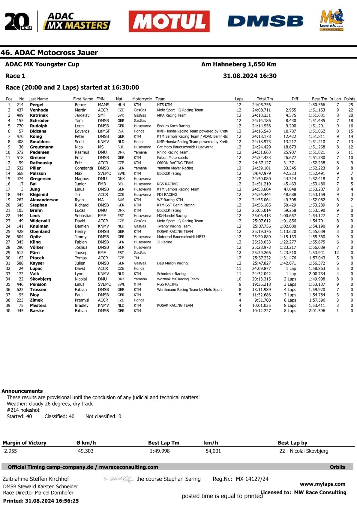 Jacobi, Pergel en Oppliger winnen eerste manche ADAC Jauer by motocrossplanet31 augustus 202431 augustus 2024 Henry Jacobi, Bence Pergel en Ryan Oppliger hebben de eerste manches van de ADAC Masters in Jauer weten te winnen. Bekijk de volledige uitslagen hieronder: