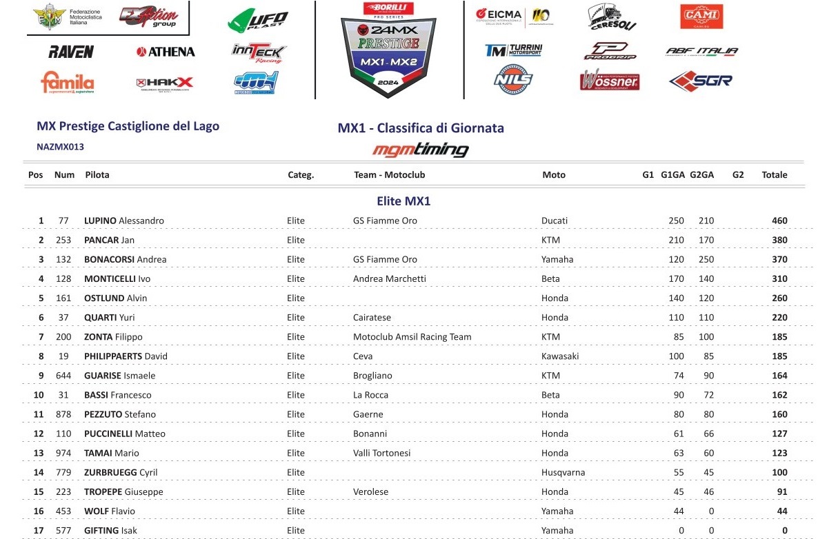 Alessandro Lupino heeft het Italiaans kampioenschap MX1 in Castiglione del Lago weten te winnen. Lupino eindigde op een eerste en een tweede plaats in de manches. Jan Pancar werd tweede met een 2-3 in de manches voor Andrea Bonacorsi 5-1.