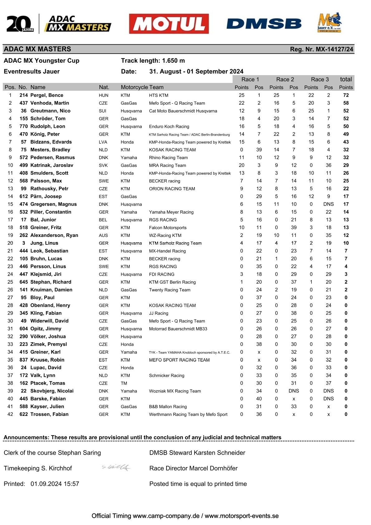 Na de pijnlijke zaterdag van Bradley Mesters bij de ADAC in Jauer waarbij hij een steen op zijn oog kreeg, is hij vandaag sterk terug gekomen in de tweede en derde manche. Mesters wist hierin zevende en vierde te worden. Naast Mesters werd Scott Smulders elfde in het dagklassement met een 8-18-11 in de manches. Damien Knuiman pakte met een negentiende plaats in de tweede manche twee punten. Lynn Valk kwalificeerde zich voor de wedstrijd en werd 34ste, 35ste en 33ste in de manches.