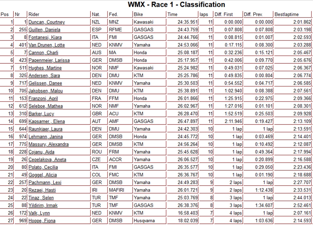De eerste manche van de WMX klasse in Turkije is gewonnen door Courtney Duncan van F&H Racing. Duncan nam gelijk de leiding en controleerde de wedstrijd. Daniela Guillen werd tweede voor Kiara Fontanesi en Lotte van Drunen. Danee Gelissen werd netjes negende en helaas haalde Lynn Valk de finish niet!