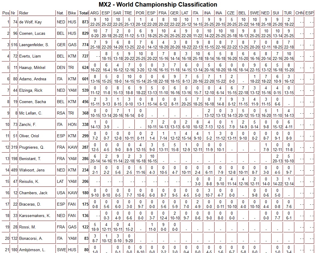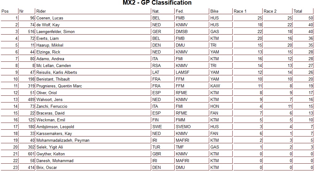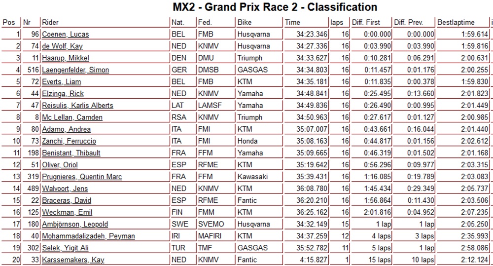 Lucas Coenen heeft beide manches van de Grand Prix MX2 in Turkije gewonnen. In de tweede manche leek het lange tijd Kay de Wolf te gaan worden maar door een fout in de laatste ronde, wist Coenen hem te passeren waardoor de Wolf tweede werd voor Mikkel Haarup.