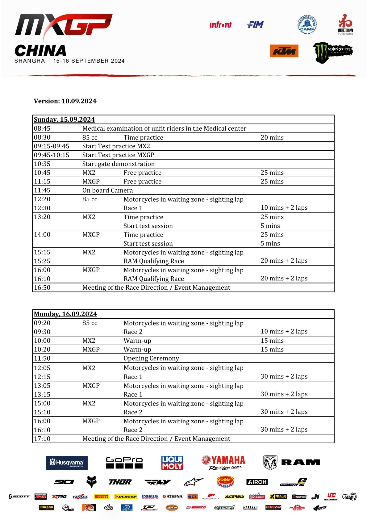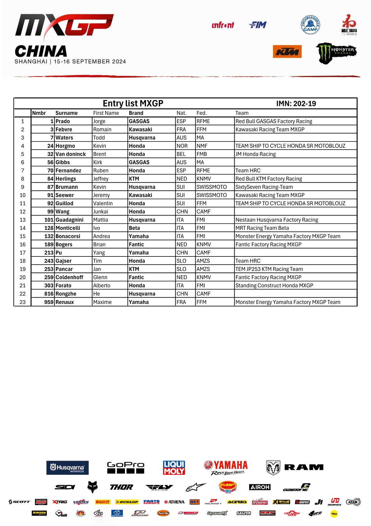 Deelnemerslijsten en tijdschema MXGP China by motocrossplanet10 september 2024 Aankomend weekend wordt de voorlaatste wedstrijd van het wereldkampioenschap verreden in China. Wie er aan de start staan kun je hieronder zien op de deelnemerslijsten: Photocredits Ray Archer