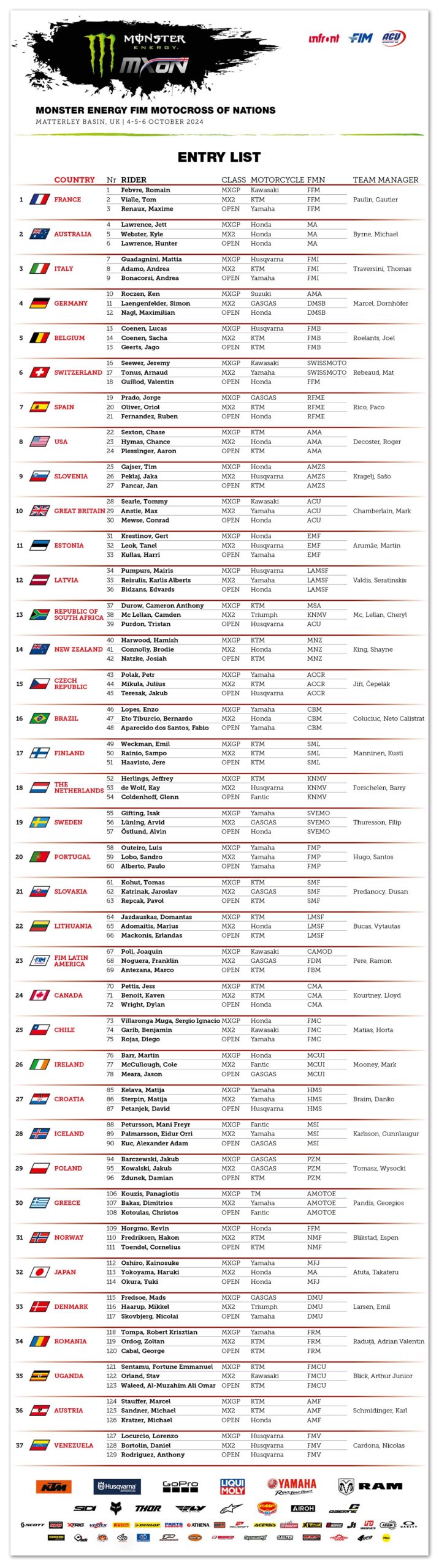 Voorlopige deelnemerslijst MX of Nations by motocrossplanet18 september 202418 september 2024 .In het weekend van 5 en 6 oktober wordt de MX of Nations verreden in Engeland. Voor een overzicht van de ingeschreven landen kunt u hieronder kijken: Photocredits – Fantic Factory Racing
