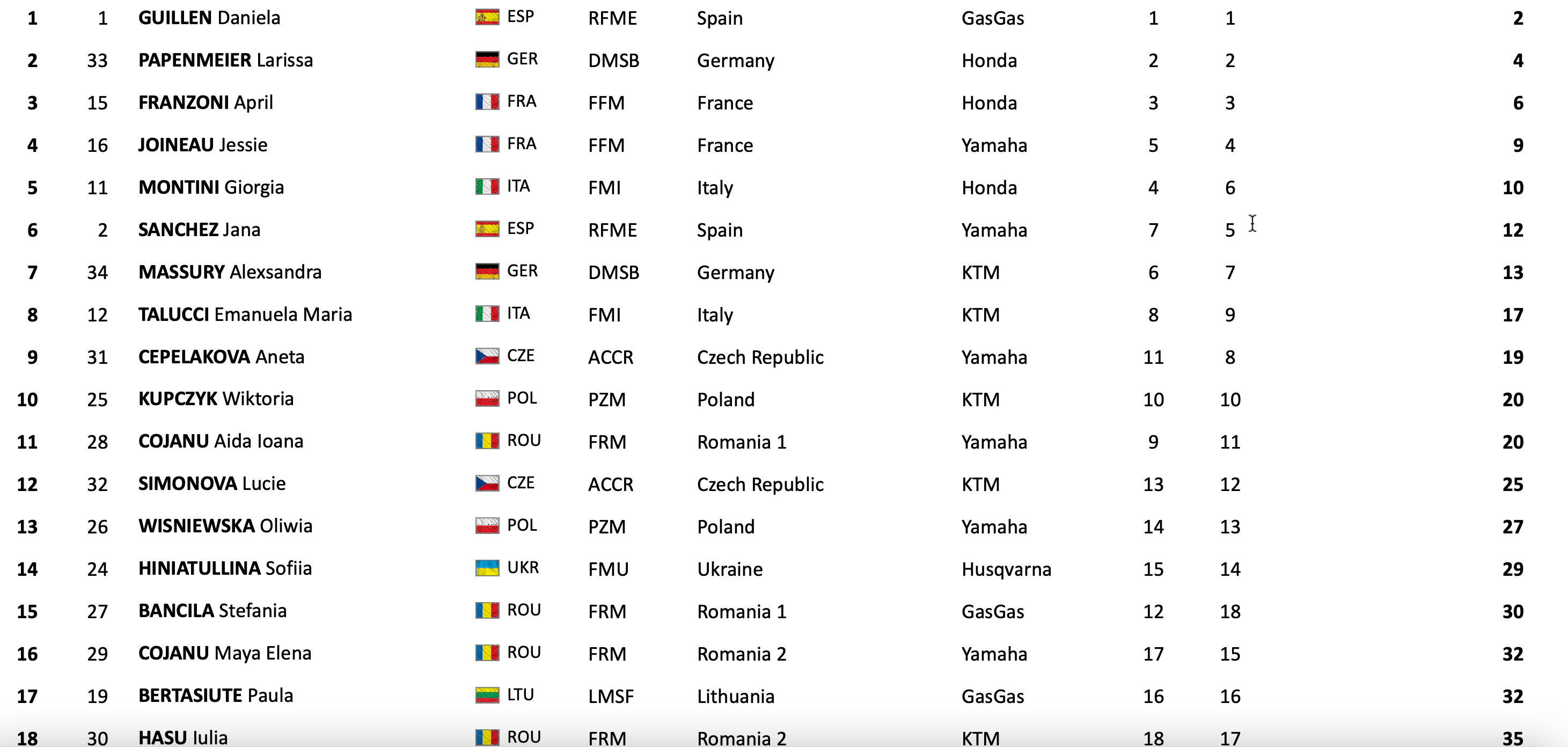 In de European of Nations voor dames ging de zege naar Spanje. Daniela Guillen wist beide manches te winnen en aan een vijfde plaats van Jana Sanchez in de eerste manche hadden de dames voldoende om de titel te pakken. Achter de Spanjaarden werden de Duitsers (Larissa Papenmeier-Alexsandra Massury) tweede voor de Italianen (April Franzoni-Jessie Joineau).