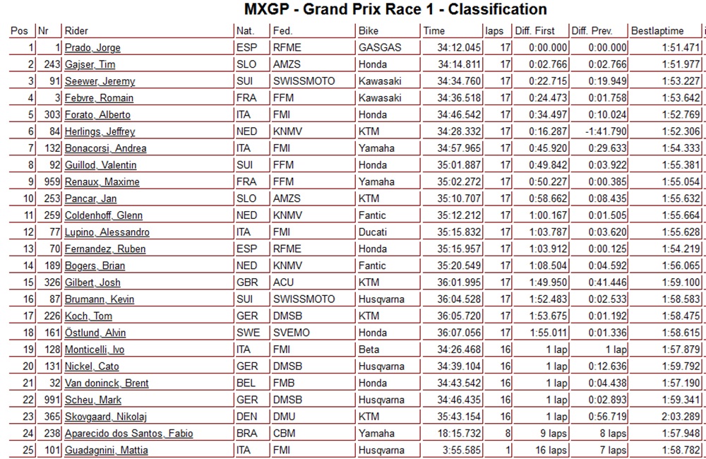 Jorge Prado heeft de eerste manche van de MXGP in Spanje weten te winnen en lijkt af te stevenen op de wereldtitel. Tim Gajser zat er gelijk bij maar moest Prado na een aantal ronden laten gaan en werd tweede. Jeffrey Herlings kwam slecht uit de start en kon er niet meer uithalen dan een derde plaats. Jeremy Seewer werd vierde voor Romain Febvre en de sterk rijdende Alberto Forato.