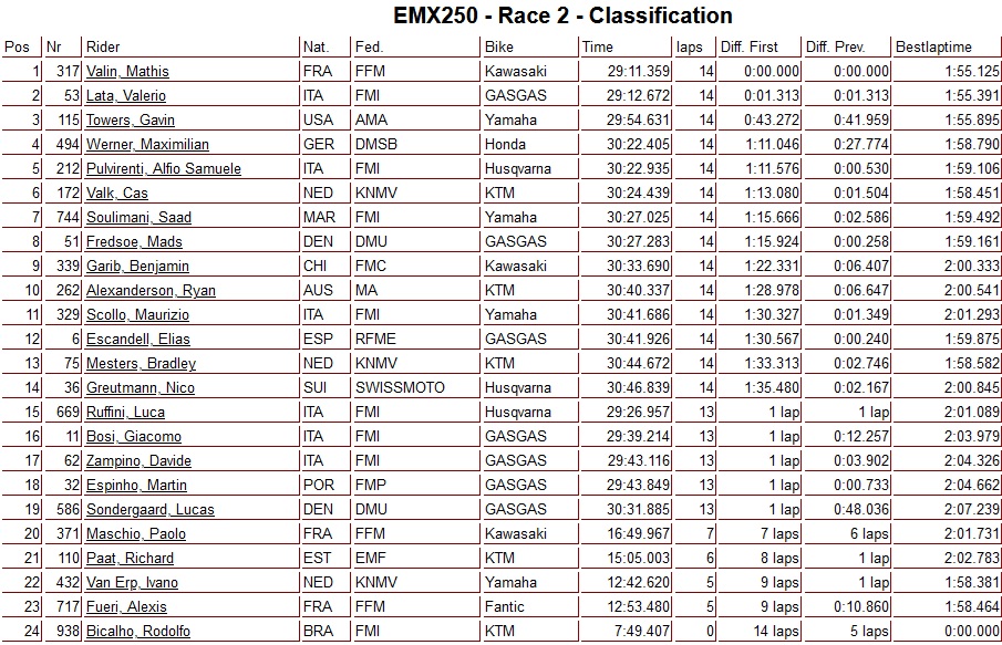 Mathis Valin heeft na een spannend gevecht met Valerio Lata de tweede manche van de EMX250 klasse in Spanje weten te winnen. Lata werd tweede en de Amerikaan Towers kwam als derde over de finish.
