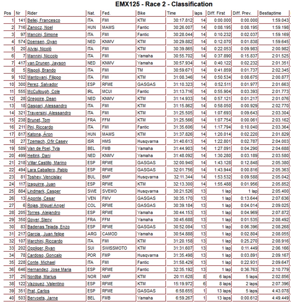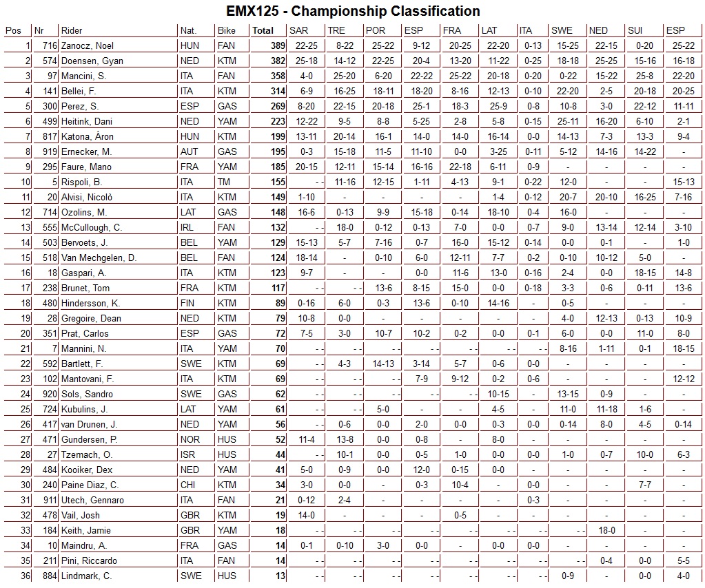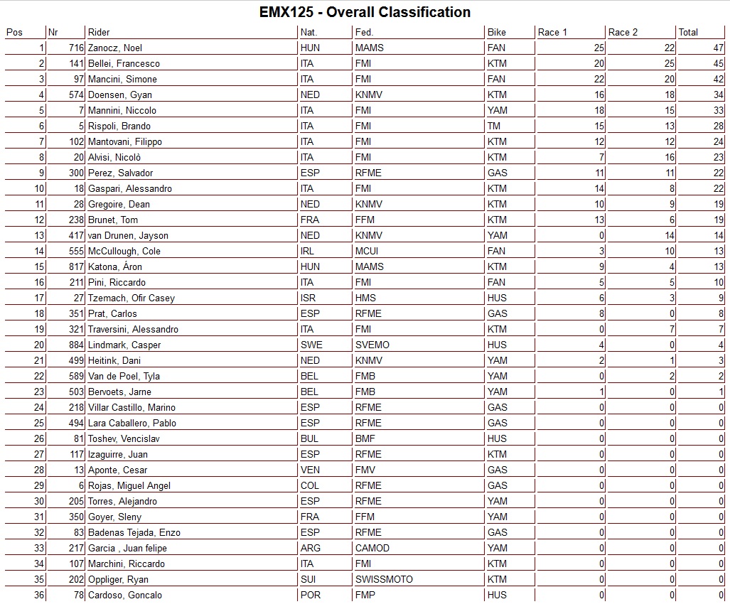 Gyan Doensen reed een sterke wedstrijd en zat net achter de kopgroep. Hij finishte als vierde en is hiermee in de eindstand van het EMX125 Kampioenschap op een tweede plaats geëindigd. Nicoli Alvisi maakte de top vijf compleet.