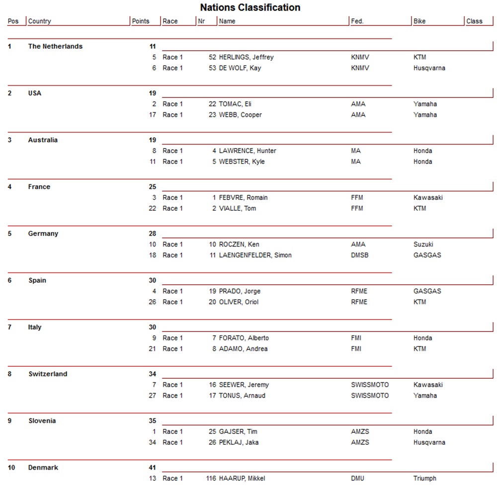 TeamNL staat na de eerste manche van de MX of Nations in Engeland aan de leiding. Herlings en de Wolf werden vijfde en zesde en scoorden constant. Herlings pakte een goede start maar kwam in de beginfase ten val en viel ver terug.