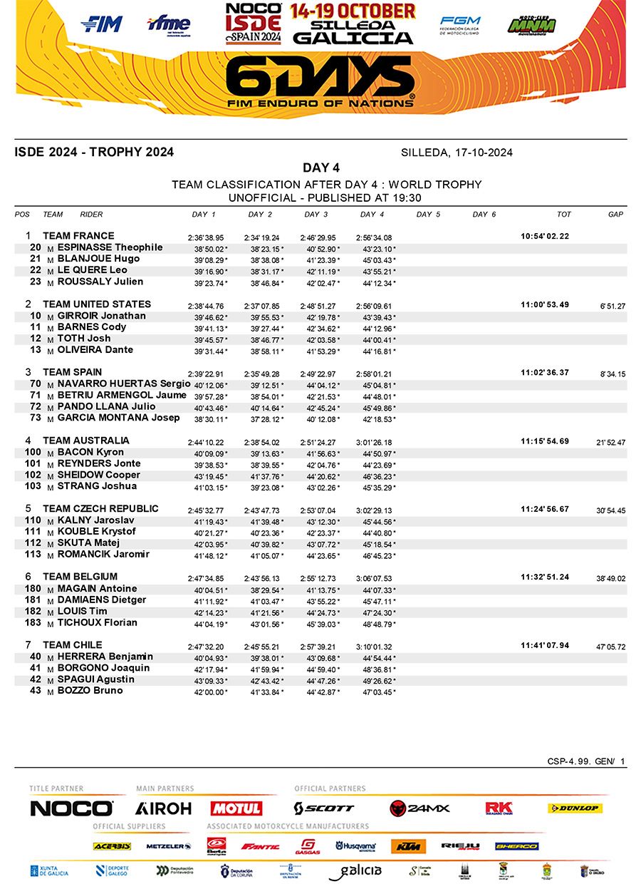 De vierde dag van de zesdaagse is opnieuw gewonnen door Josep Garcia. Ditmaal wist hij gedurende de dag een voorsprong van dertig seconden op te bouwen ten opzichte van Steve Holcombe. In de World Trophy blijft Frankrijk aan de leiding staan maar de Amerikanen hebben Spanje van de tweede plaats weten te verdringen.