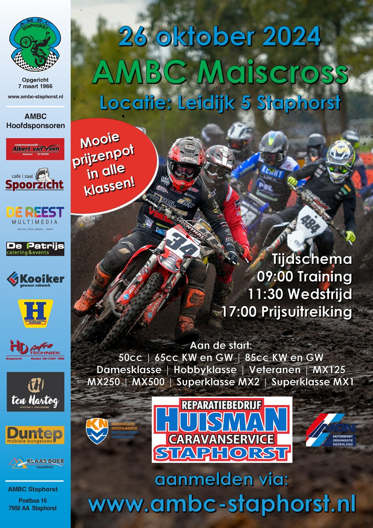 Nog ruim een week en dan is het alweer tijd voor de Staphorster motorclub AMBC om het crossjaar 2024 af te sluiten. Dit gebeurt traditioneel met de jaarlijkse Maiscross. Zaterdag 26 oktober zullen de crossmotoren weer brullen op dezelfde locatie als vorig jaar, het maïsland ter hoogte van Leidijk 5 in Staphorst.