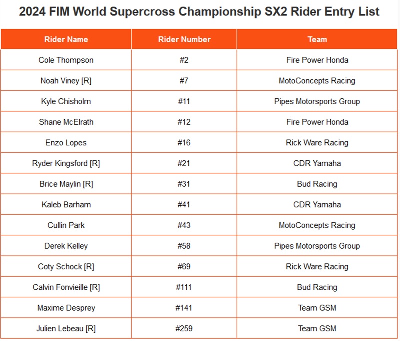 Deelnemers SX2 klasse WK Supercross bekend by motocrossplanet22 oktober 2024 Aankomend weekend gaat het wereldkampioenschap supercross van start in Canada. De organisatie heeft vandaag de vaste deelnemers van de SX2 klasse bekend gemaakt. Bekijk de deelnemerslijsten hieronder: