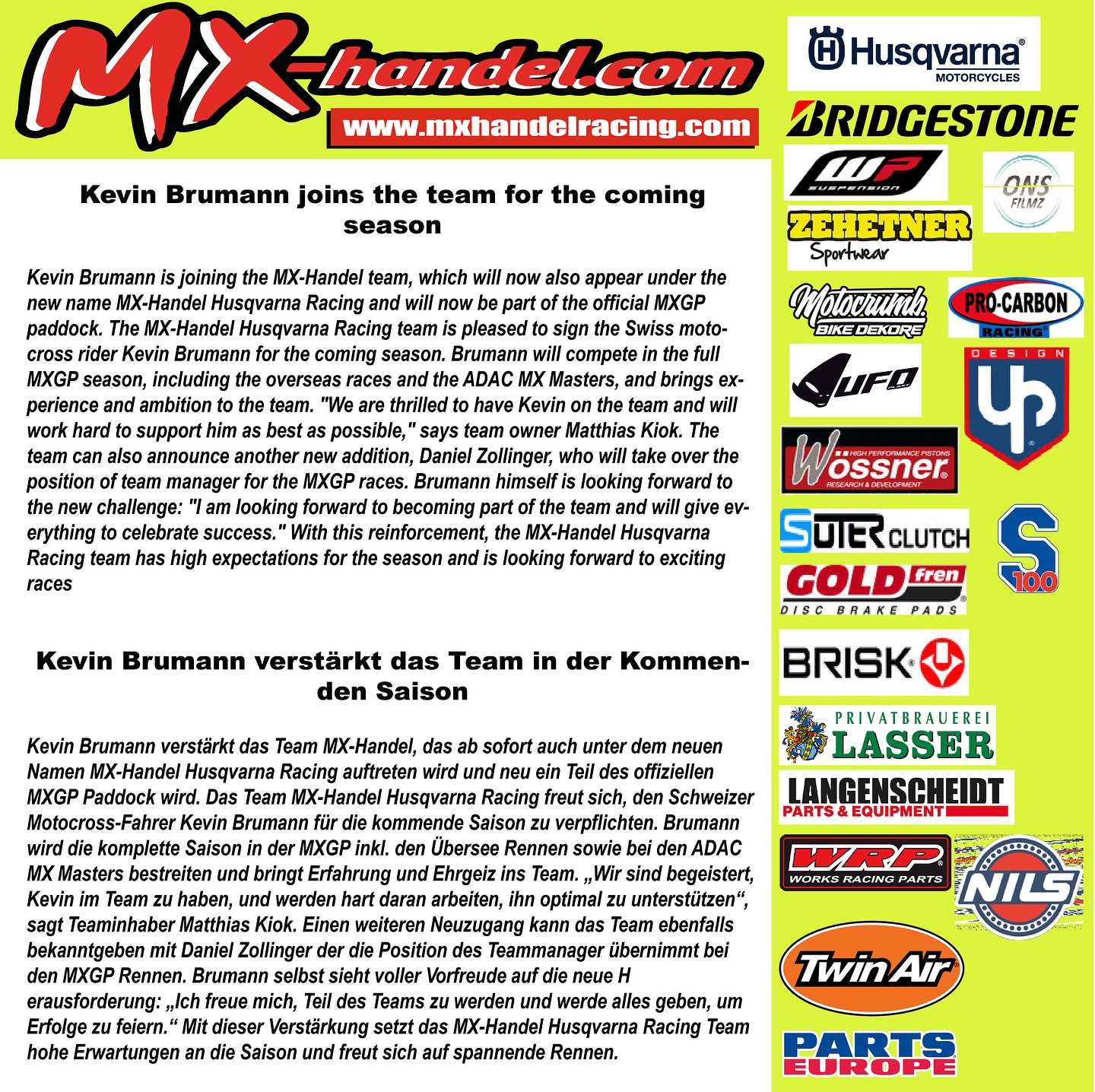 Kevin Brumann is een samenwerking aangegaan met het MX Handel Husqvarna team voor seizoen 2025. Dit is een nieuw team in de MXGP paddock. Naast de wedstrijden van het wereldkampioenschap zal Brumann ook de Duitse ADAC Masters Series rijden!