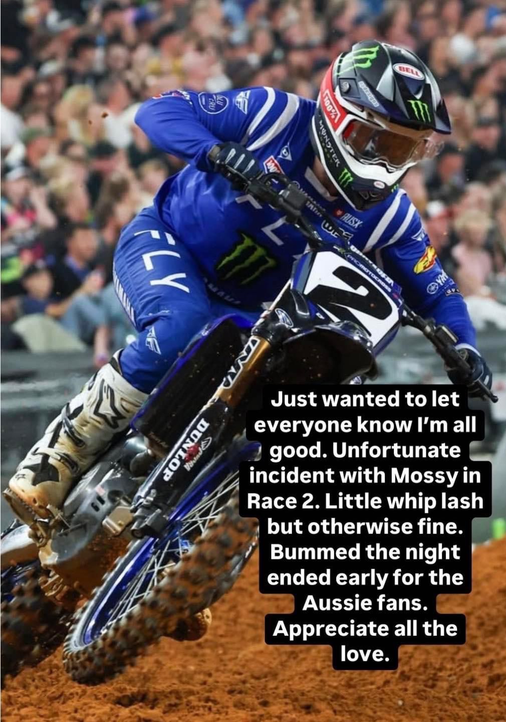 Cooper Webb is ok by motocrossplanet30 november 202430 november 2024 Cooper Webb kwam in de tweede finale van de Australian Supercross Open in Melbourne ongelukkig ten val en bezeerde zich hierbij. Via social media liet Webb weten ok te zijn maar het blijft twijfelachtig of we hem morgen in actie gaan zien.