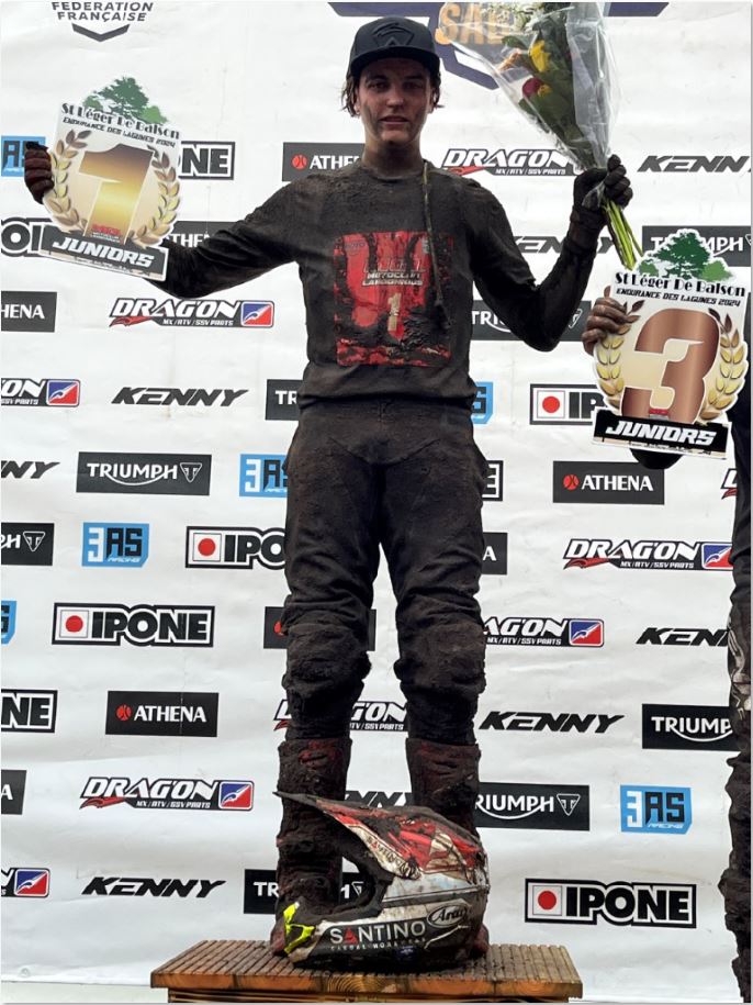 In de klasse Juniors had Damien in Hossegor een redelijke start en kwam als 3e door de eerste bocht. Hij moest iets naar buiten uitwijken waardoor hij als 4e de wedstrijd begon. Al snel wist Damien door te schuiven naar een 3e plaats, maar na een aantal ronden in de race zat het hem niet helemaal mee. Tijdens het inhalen van achterblijvers viel hij enkele keren. Gelukkig kon hij telkens weer de aansluiting vinden bij de kopgroep. Uiteindelijk wist hij de kopman te passeren en na een snelle pitstop een gat te slaan van 43 seconden. Geconsolideerd wist hij zijn voorsprong te handhaven en hiermee de wedstrijd op zijn naam te schrijven. Hij wist de rode plaat (eerste plaats in de tussenstand van het kampioenschap) weer terug te pakken.