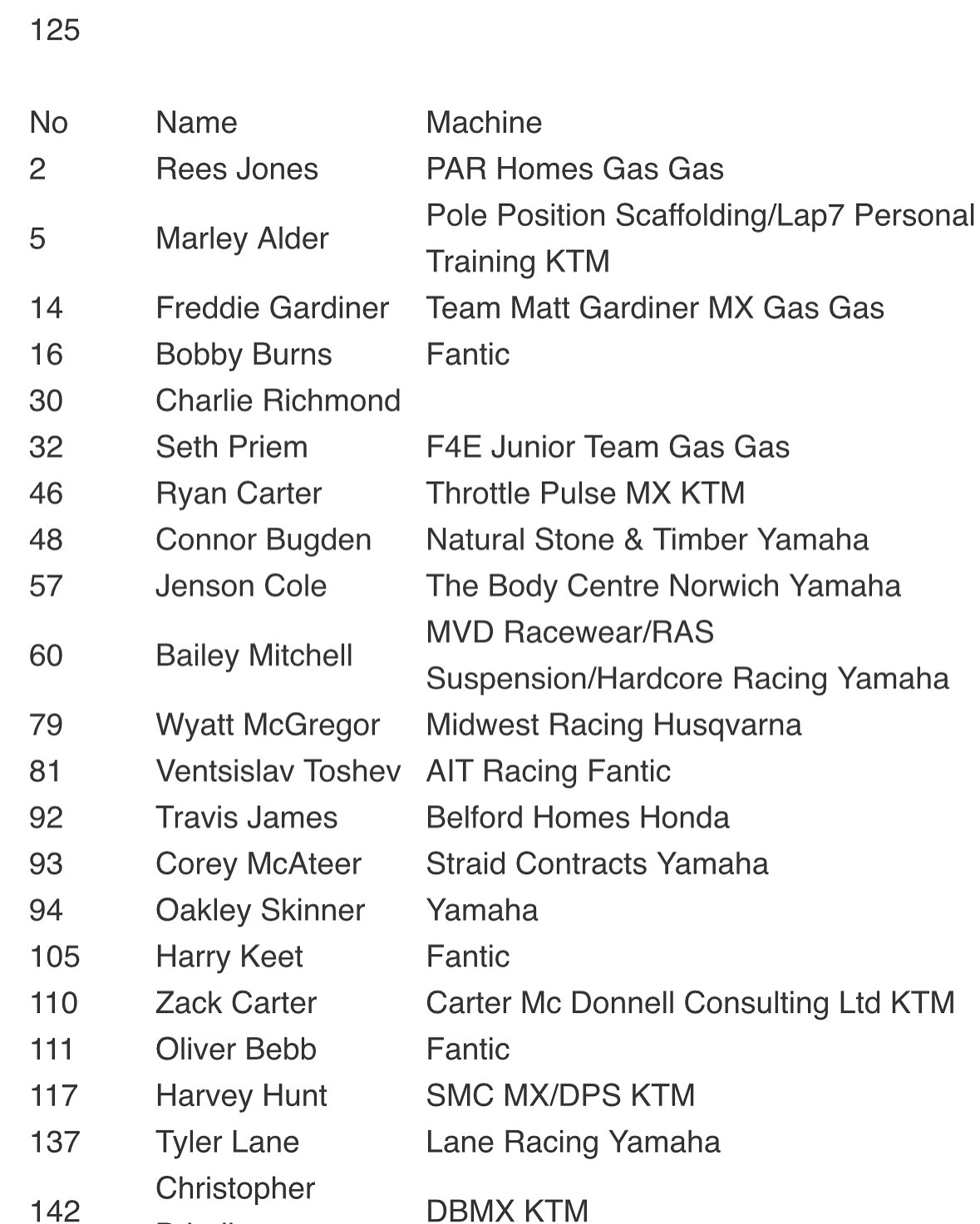 Deelnemerslijst 125 klasse Hawkstone Park bekend by motocrossplanet9 januari 2025 Op zondag 9 februari wordt de eerste grote internationale wedstrijd van het seizoen verreden in Hawkstone Park. Hier komt ook de 125cc klasse aan de start. Wie er mee doen zie je op de deelnemerslijst hieronder: