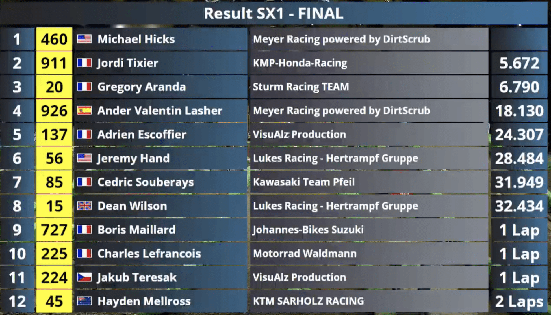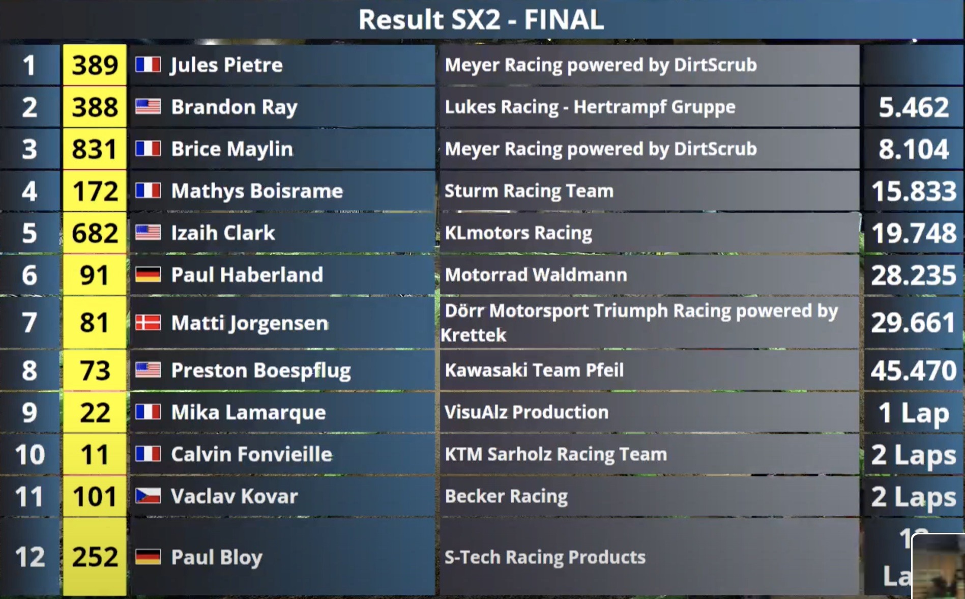 De zege in de SX2 klasse ging naar de jonge Fransman Jules Pietre voor Brandon Ray en Brice Maylin. Mathys Boisrame en Izaih Clark maakten de top vijf compleet.
